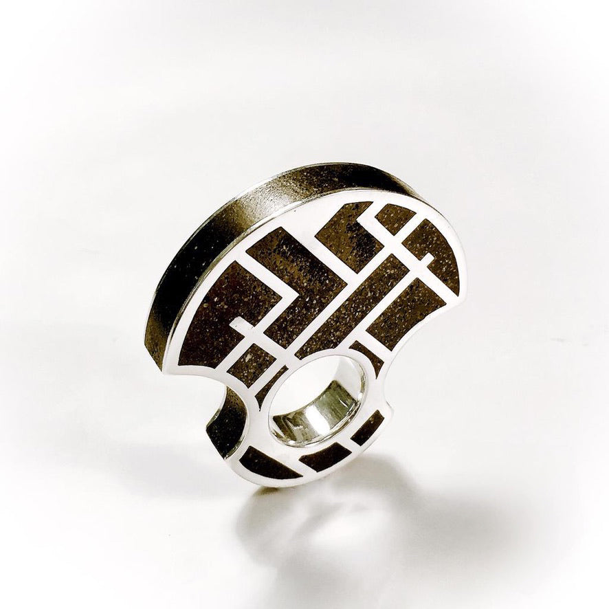 An expressive ring crafted from white gold and black concrete, offering a contemporary interpretation of Art Nouveau elegance. Its monumental design spans across three fingers, transforming the jewel into a sculptural presence of striking and refined beauty. An extraordinary statement piece that unites elegance with avant-garde.