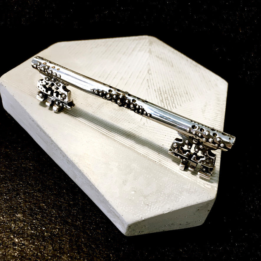 A client commissioned an exclusive interpretation of the iconic Berlin Key, first introduced in the 1950s. Its unique mechanism features two locks – front and back – that can only be opened by fully passing the key through. This bespoke piece in precious metal transforms functional industrial design into a finely crafted jewelry object – custom-made by Rabbit in the Hat.