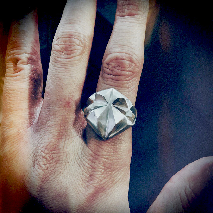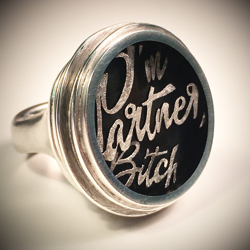 An extraordinary statement ring featuring the 3D lettering I’m Partner Bitch. Commissioned by a client to celebrate their promotion with a bold declaration – inspired by a famous remark from Mark Zuckerberg. A piece that embodies both confidence and wit, becoming a striking companion in everyday life.