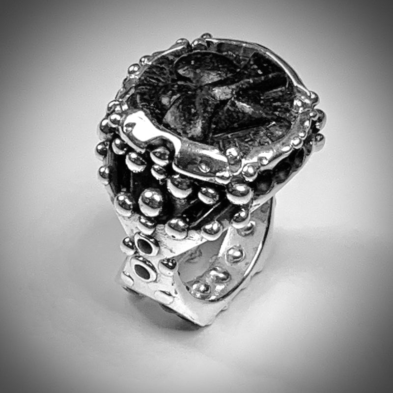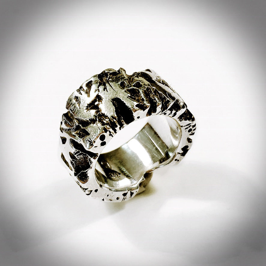 A ring with a bold, raw presence, its form and surface deliberately crafted to radiate strength. Handcrafted in detail, it holds at its center a bullet fired by the client, appearing embedded as if just struck. A bespoke creation that transforms personal history into a powerful symbol.