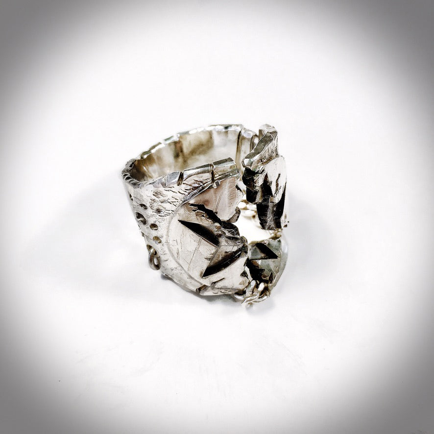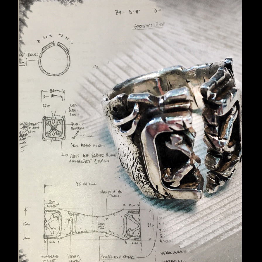 A fractured ring crowned with crossed bones in a raw pirate style. Handcrafted as a bespoke creation, it unites rupture and rebellion into a striking symbol of freedom and independence. A unique piece that translates the spirit of the pirate era into contemporary jewelry design.