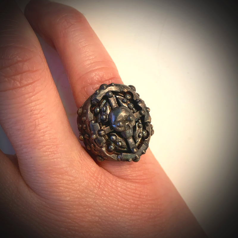 A black ring featuring a striking skull, raw yet finely detailed. Handcrafted as a bespoke creation, it fuses rebellion and symbolism into a powerful statement. A one-of-a-kind piece with unmistakable presence.