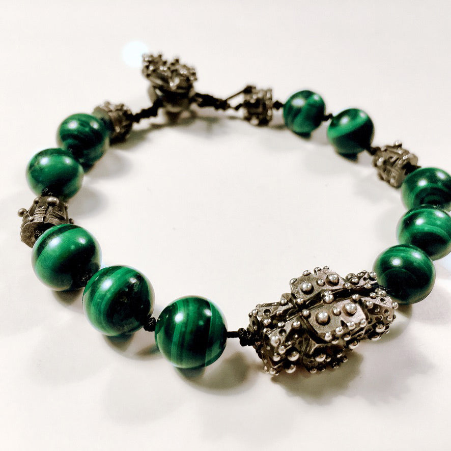 A custom bracelet crafted from green malachite and blackened silver. The stone’s vivid texture contrasts with the darkened metal, creating a sense of mysterious depth. Handcrafted as a unique piece, it radiates a strong and distinctive character.