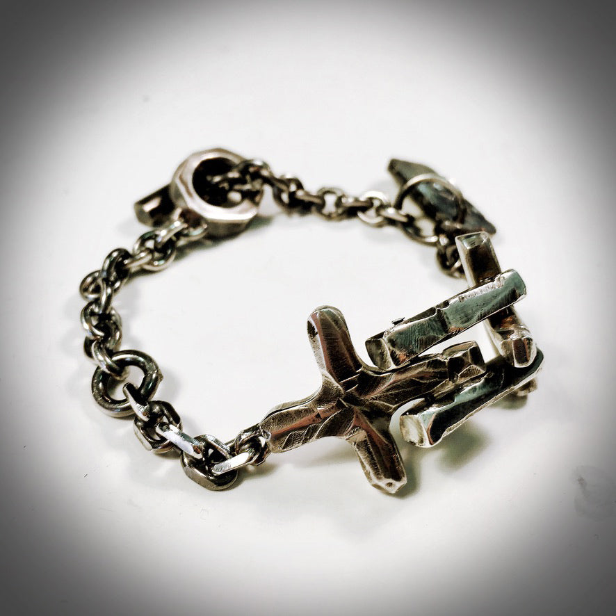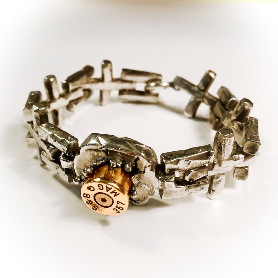 A striking bracelet with a raw, powerful character, each link meticulously handcrafted. At its center lies a bullet, fired by the client, embedded in the piece as if it had just struck. A bespoke creation that unites personal history, strength, and symbolism in a truly unique jewel.
