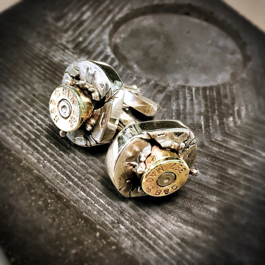 Cufflinks with a powerful presence, designed with an intentionally raw aesthetic. Each detail handcrafted, with a bullet at the center – fired by the client – appearing embedded as if just struck. A bespoke creation that transforms personal history into wearable symbols of strength.