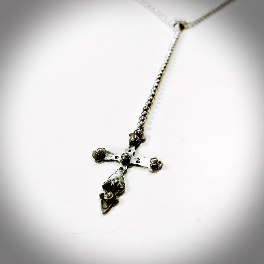 A small silver cross pendant, enriched with delicate ornamentation that lends the classic symbol a distinctive character. Meticulously handcrafted, it unites spiritual meaning with artistic detail. Despite its subtle size, it stands as a powerful emblem of faith and style. A bespoke creation that balances simplicity with expressive strength.