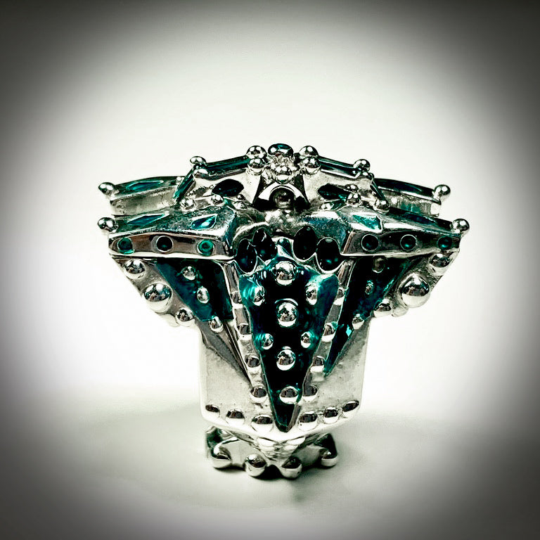 An opulent ring shaped like a crown, adorned with abstract details and coated in vibrant enamel. Handcrafted as a bespoke piece, it combines regal symbolism with artistic richness. A lavish jewel that embodies strength, splendor, and individuality.