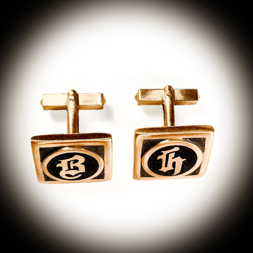 Special cufflinks made of gold and concrete, featuring the wearer's initials as gold inlays. Finely handcrafted as a custom piece, they combine precious material with unexpected rawness and clear symbolism. An exceptional pair that strikingly expresses personality and style.
