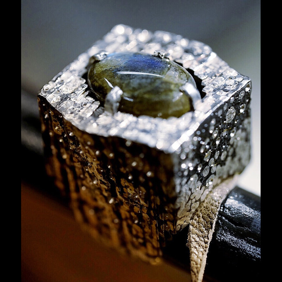 A monumental ring crafted from massive soldered plates, radiating a powerful presence. At its center rests a mystical labradorite, shimmering with depth and mystery. Handcrafted as a bespoke piece, it unites raw strength with enigmatic elegance.