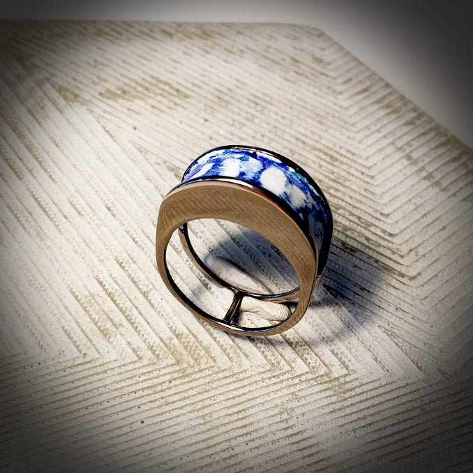An engagement ring inspired by traditional Portuguese tiles, abstractly reinterpreted in blue and white enamel. Handcrafted as a bespoke piece, it fuses cultural symbolism with timeless elegance. A unique jewel that transforms love into an artistic form.