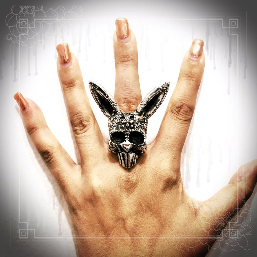 A massive silver ring shaped as a rabbit skull, adorned with Mexican-inspired ornamentation. Rich in detail and mystery, it features movable ears that add a playful dimension. Handcrafted as a bespoke piece, it is an extraordinary jewel balancing memento mori with whimsical symbolism.