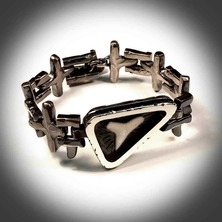 A massive, blackened bracelet with a raw surface, centered around a real shark tooth. The tooth was taken from a dive where the client unexpectedly encountered a shark – and the predator lost its tooth. Handcrafted as a bespoke creation, the piece transforms an extraordinary experience into a powerful symbol of nature’s force and survival.