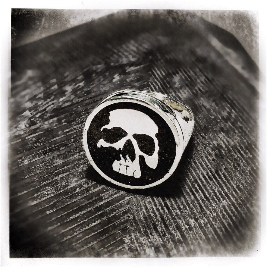 A solid ring featuring a flatly rendered skull, minimal in form yet powerful in presence. Handcrafted as a bespoke piece, it combines simplicity with striking symbolism. A unique creation that subtly conveys strength and rebellion.