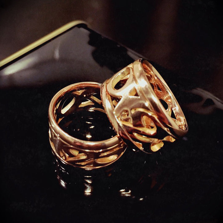 A pair of wedding rings in rose gold, custom-made for the couple. The central band carries a special inscription, turning the rings into unique symbols of their bond. Handcrafted, timeless, and deeply personal.