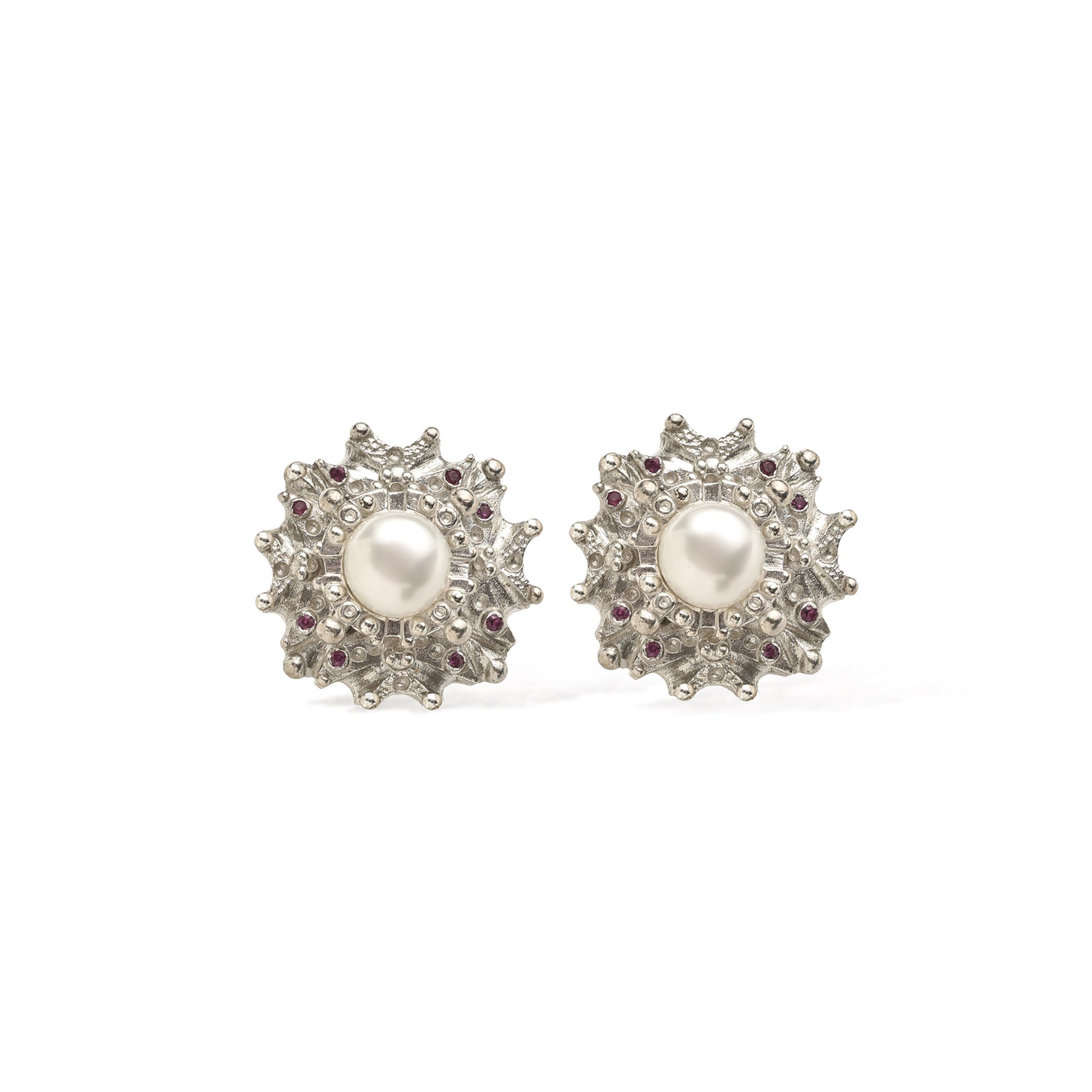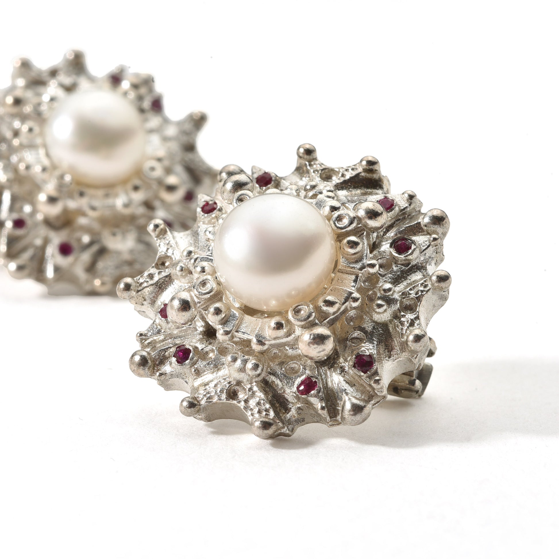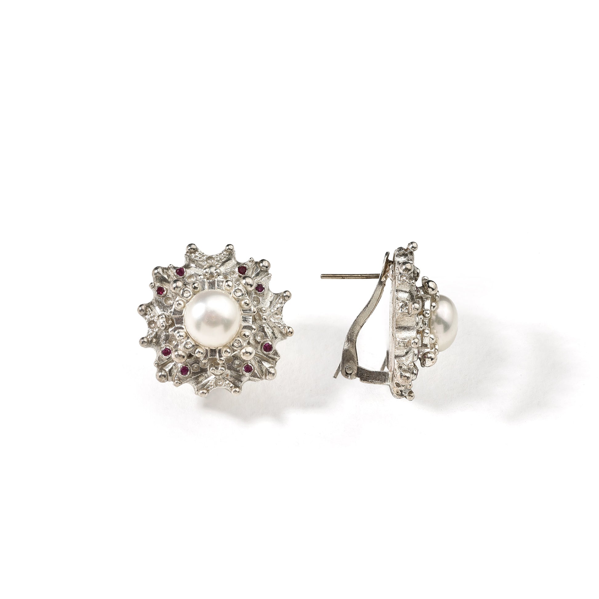 Large, magnificent ear studs with elegant pearl and sparkling rubies. The elaborate silver setting in baroque design language emphasizes the precious elements. A luxurious accessory from our collection that impresses with its opulent appearance and artful refinement.
