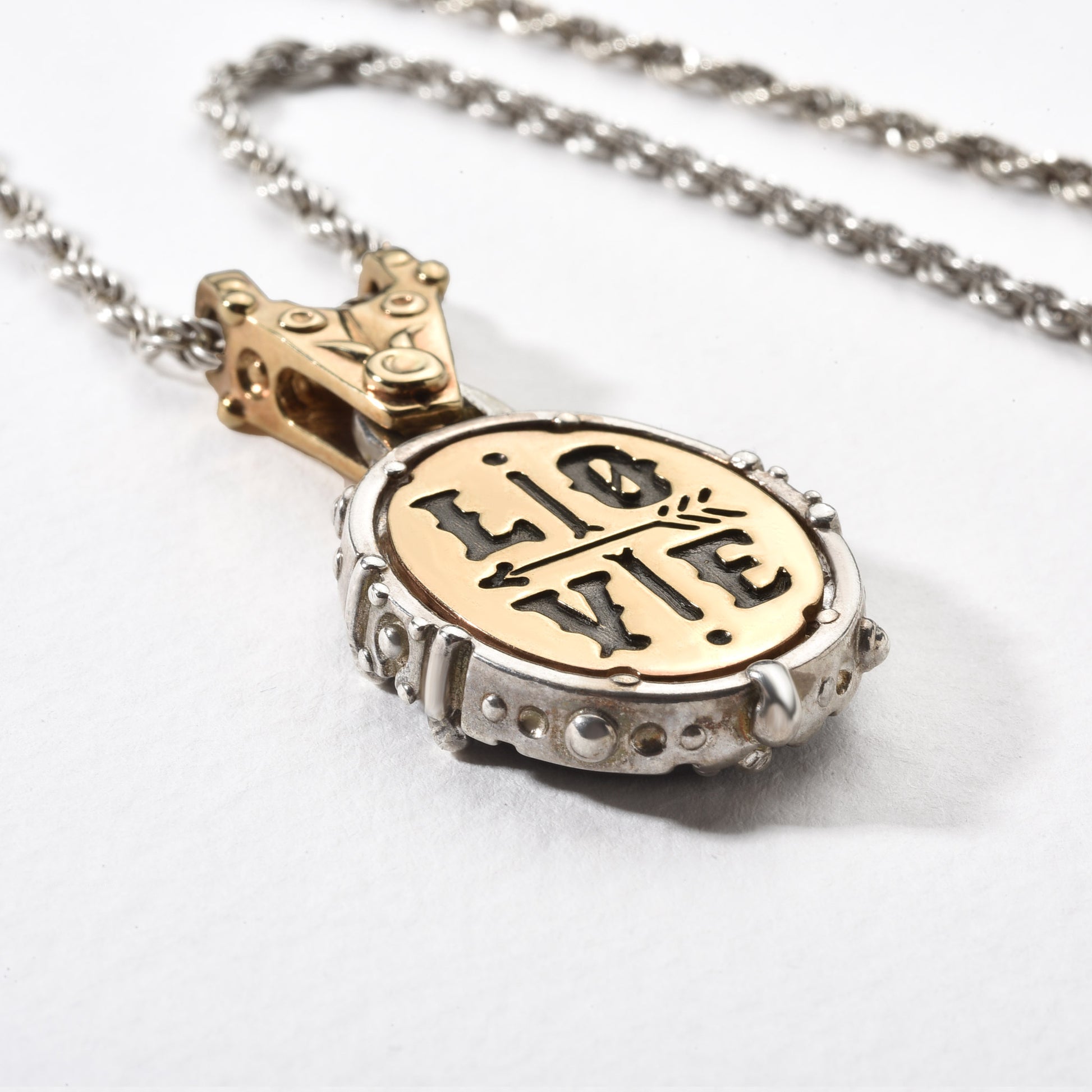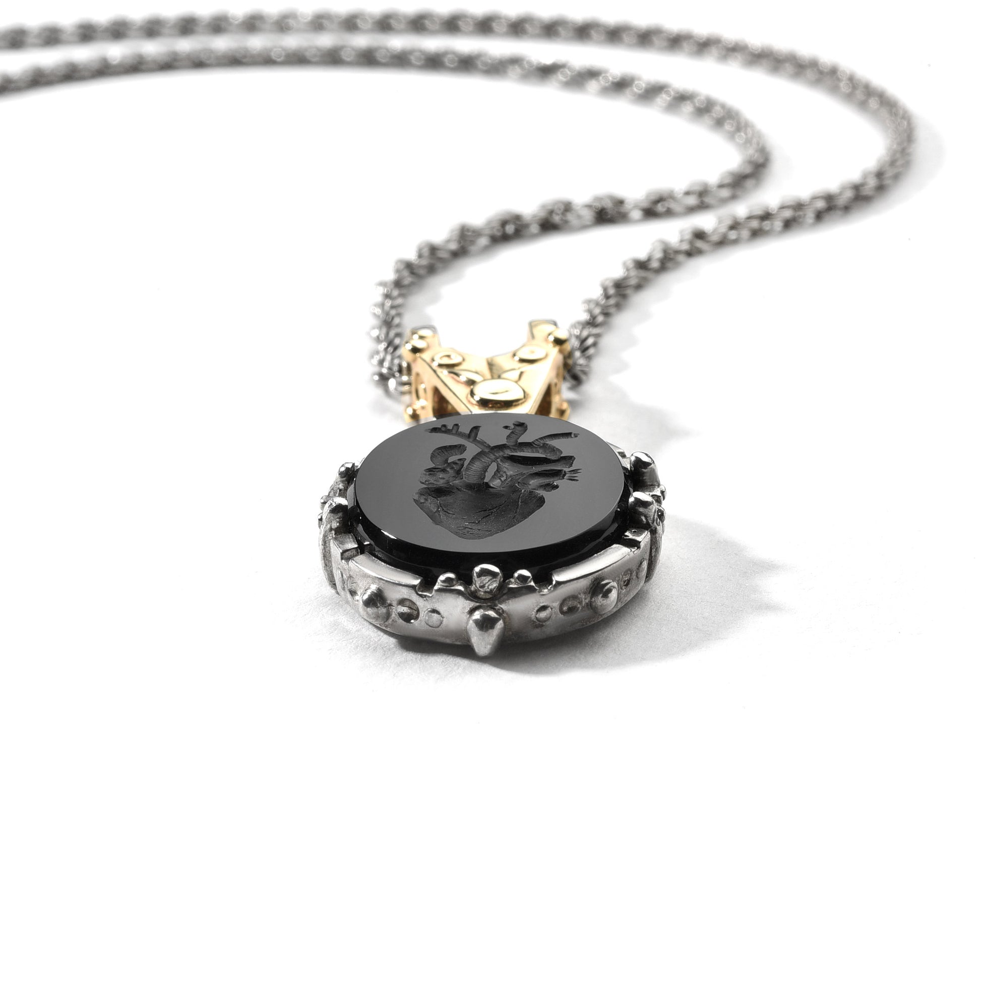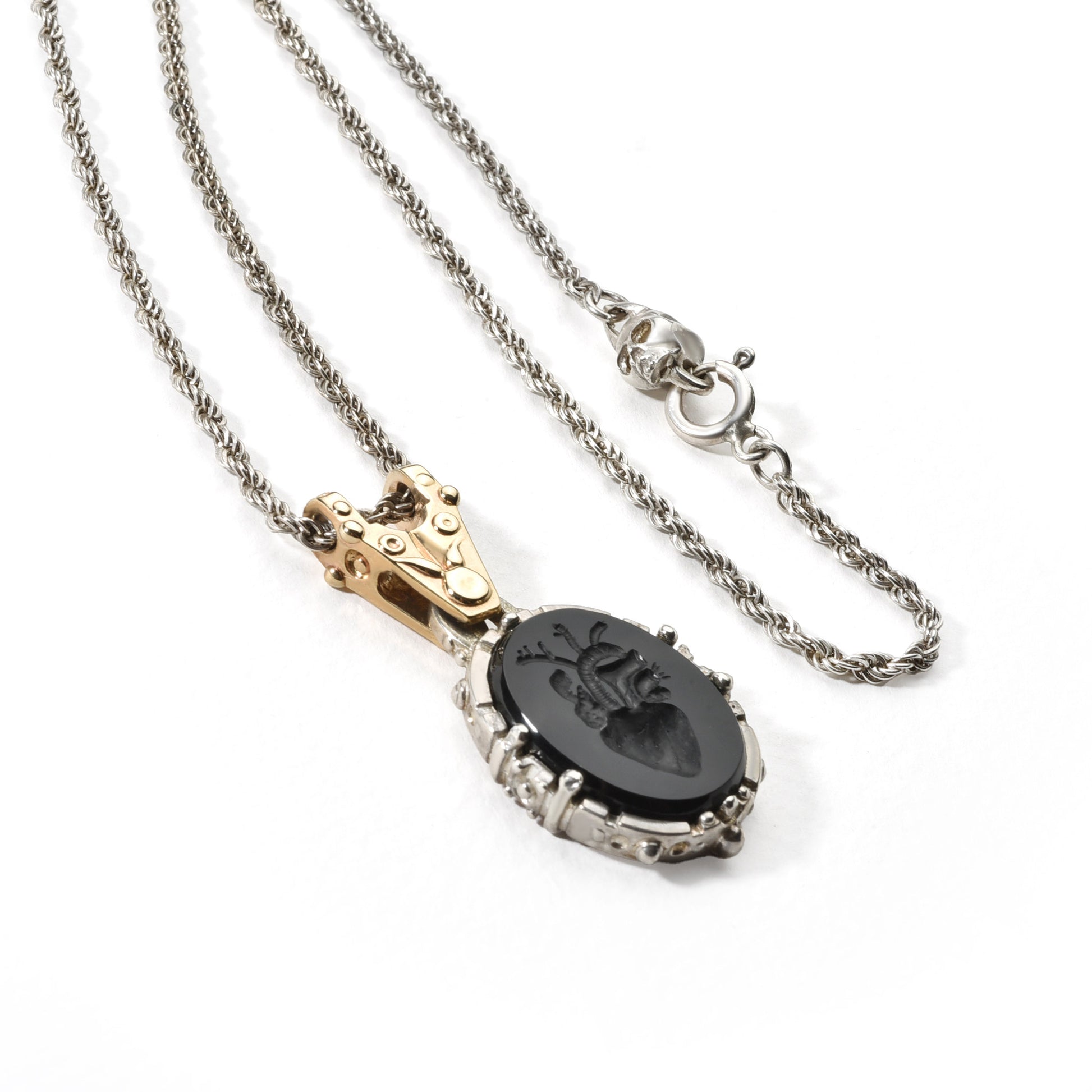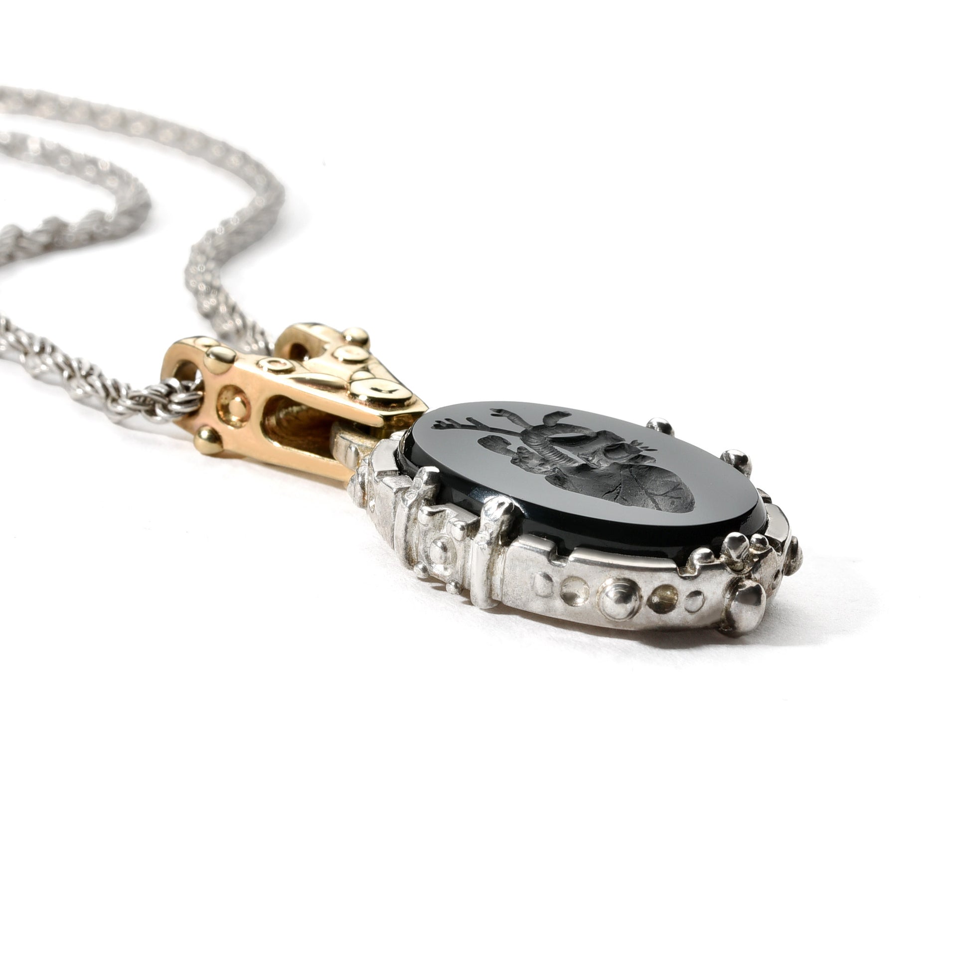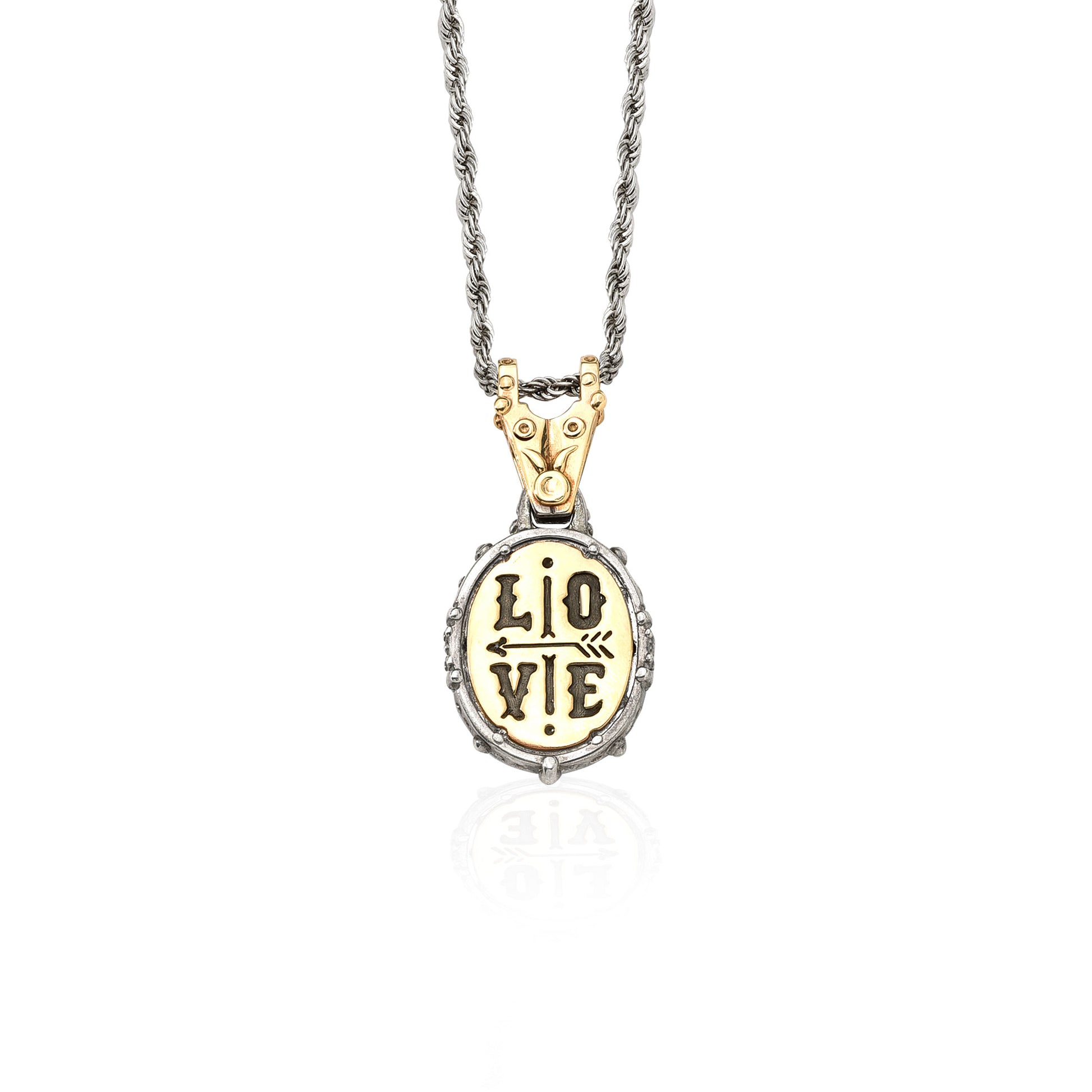 Sophisticated reversible amulet in noble bicolor design. One side features an elegant "Love" inscription, the other a black onyx with engraved heart. A versatile statement piece from our Baroque collection with symbolic depth and masterful perfection.