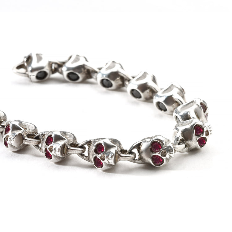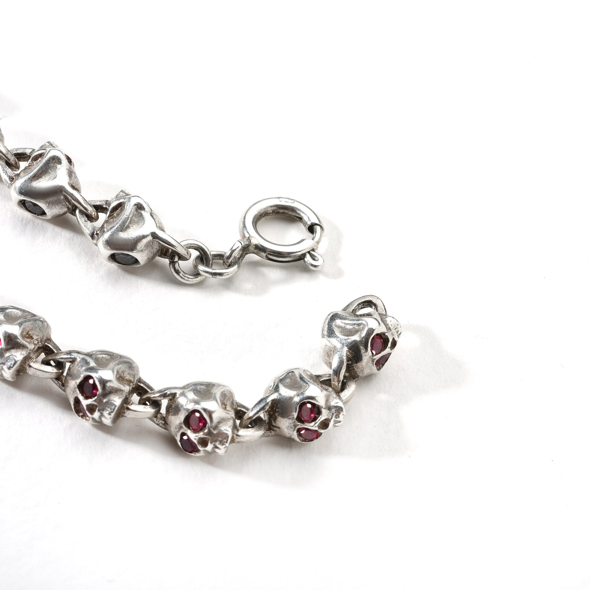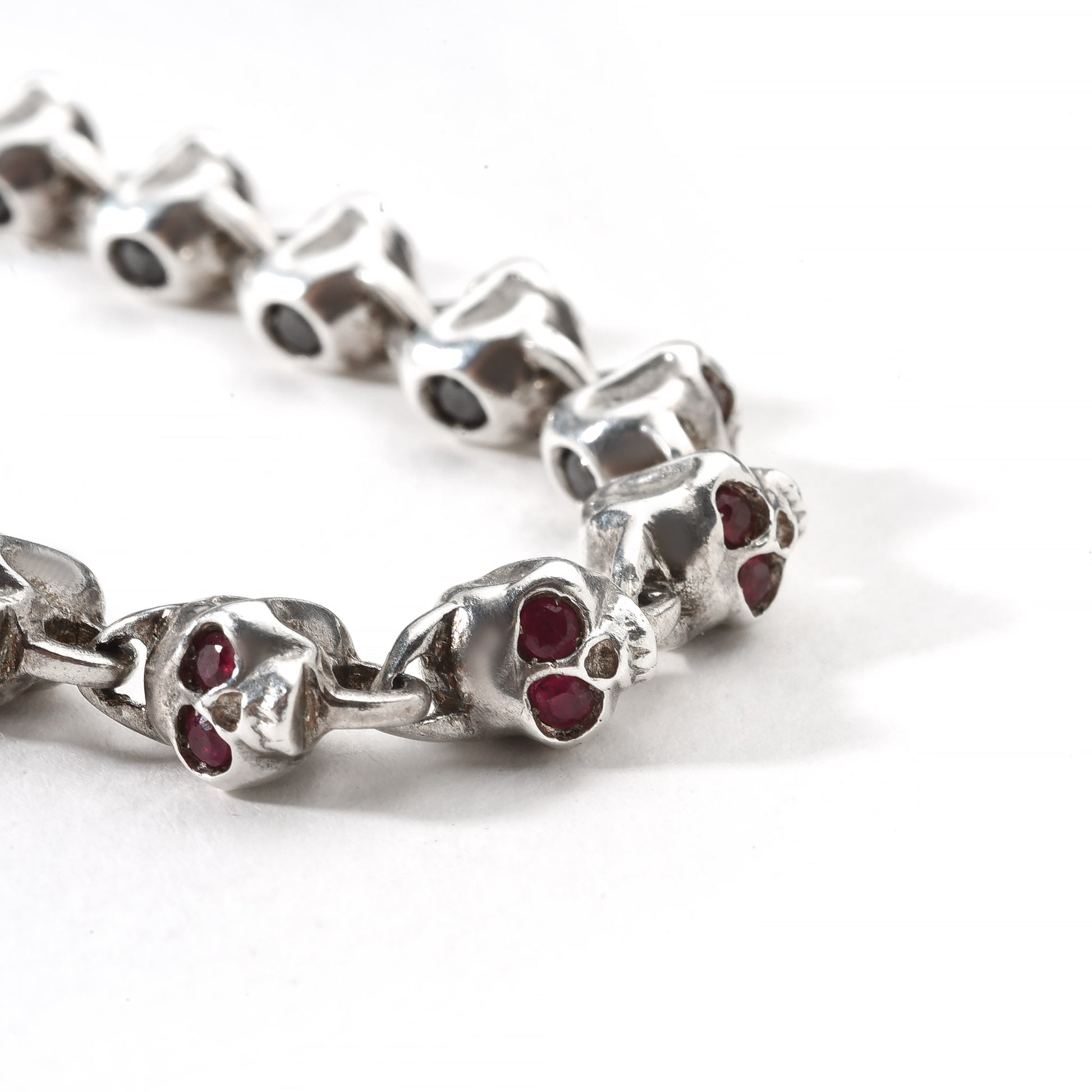 Extraordinary bracelet with Memento Mori inspiration, completely made of linked skulls. The ruby-set eyes and black diamonds in the skull backs give this dramatic piece of jewelry a mystical depth and opulent splendor. A fascinating statement piece from our Baroque collection with symbolic expressiveness and masterful craftsmanship.