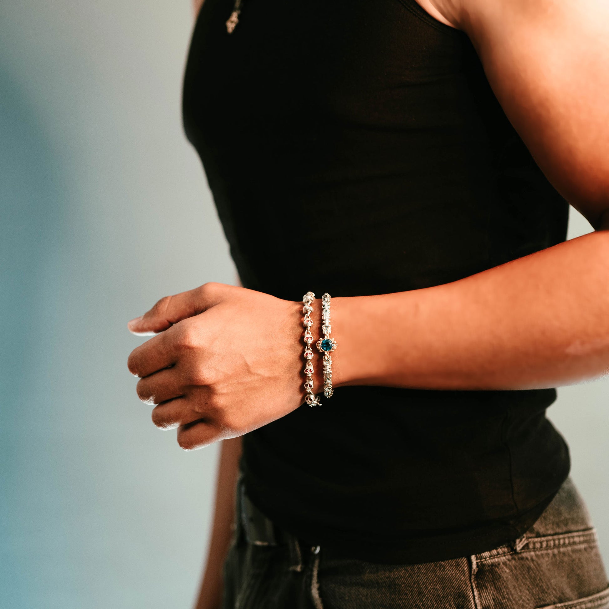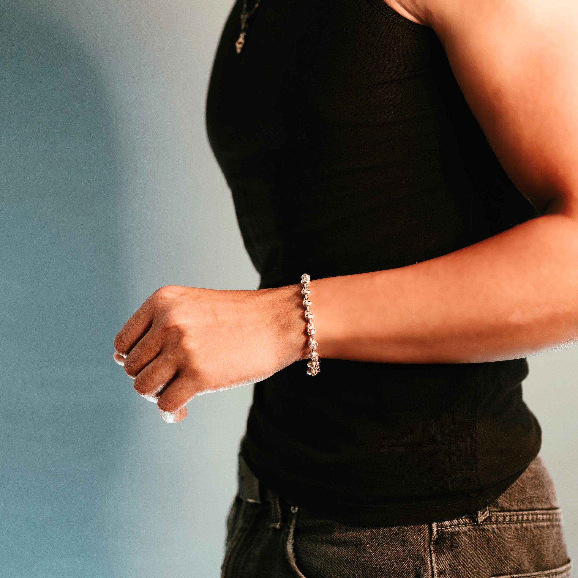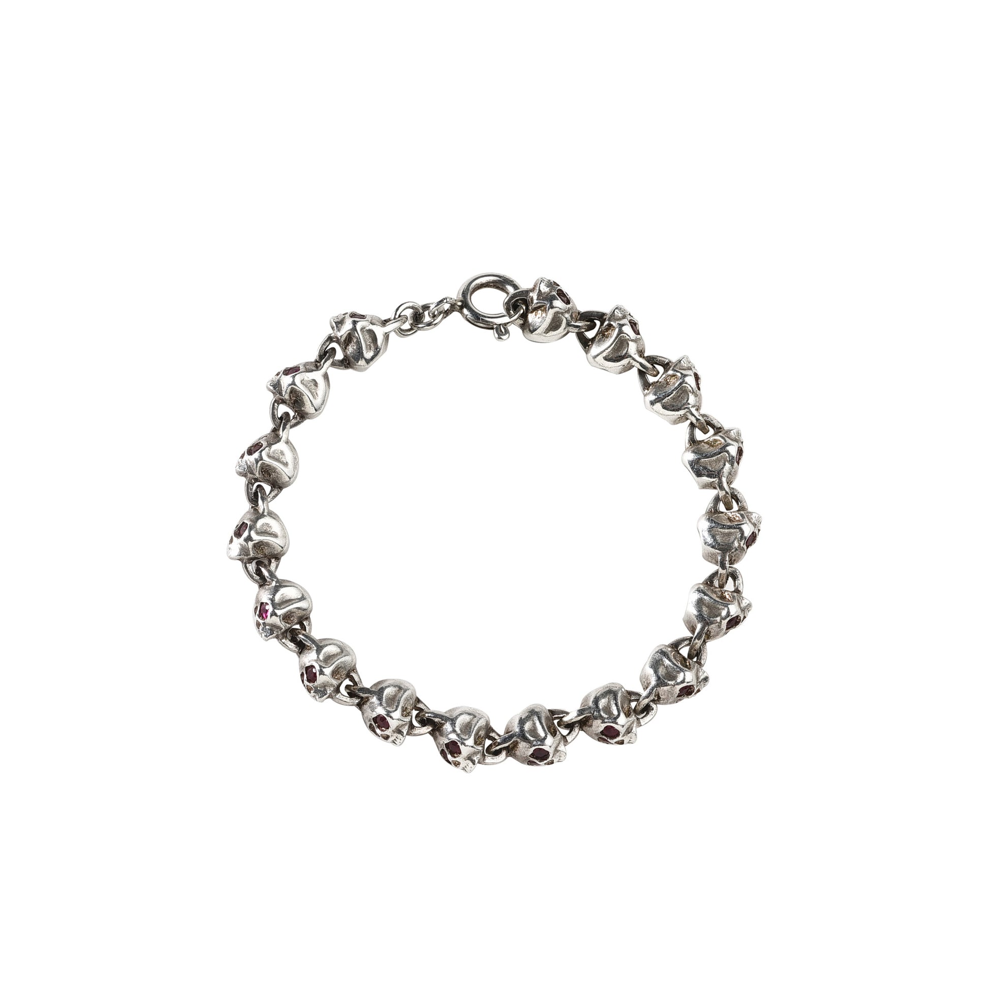Extraordinary bracelet with Memento Mori inspiration, completely made of linked skulls. The ruby-set eyes and black diamonds in the skull backs give this dramatic piece of jewelry a mystical depth and opulent splendor. A fascinating statement piece from our Baroque collection with symbolic expressiveness and masterful craftsmanship.