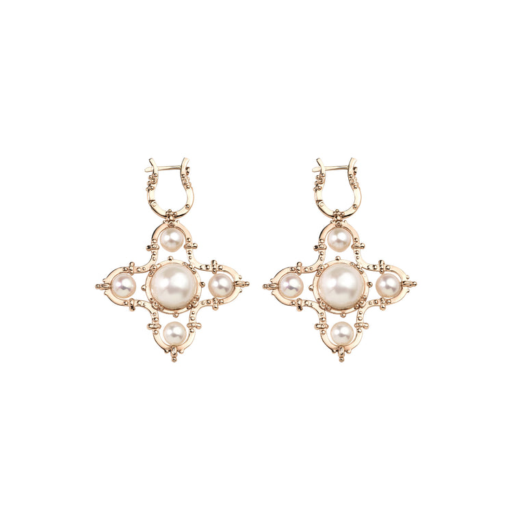 Majestic pair of statement earrings in the shape of a Venetian cross, crafted from 14k gold and adorned with impressively large South Sea pearls. The lush baroque design recalls the opulence of a bygone era, celebrating ornament as a form of art.