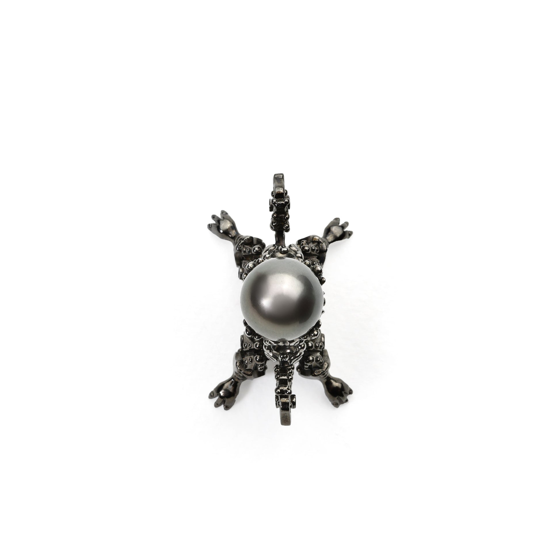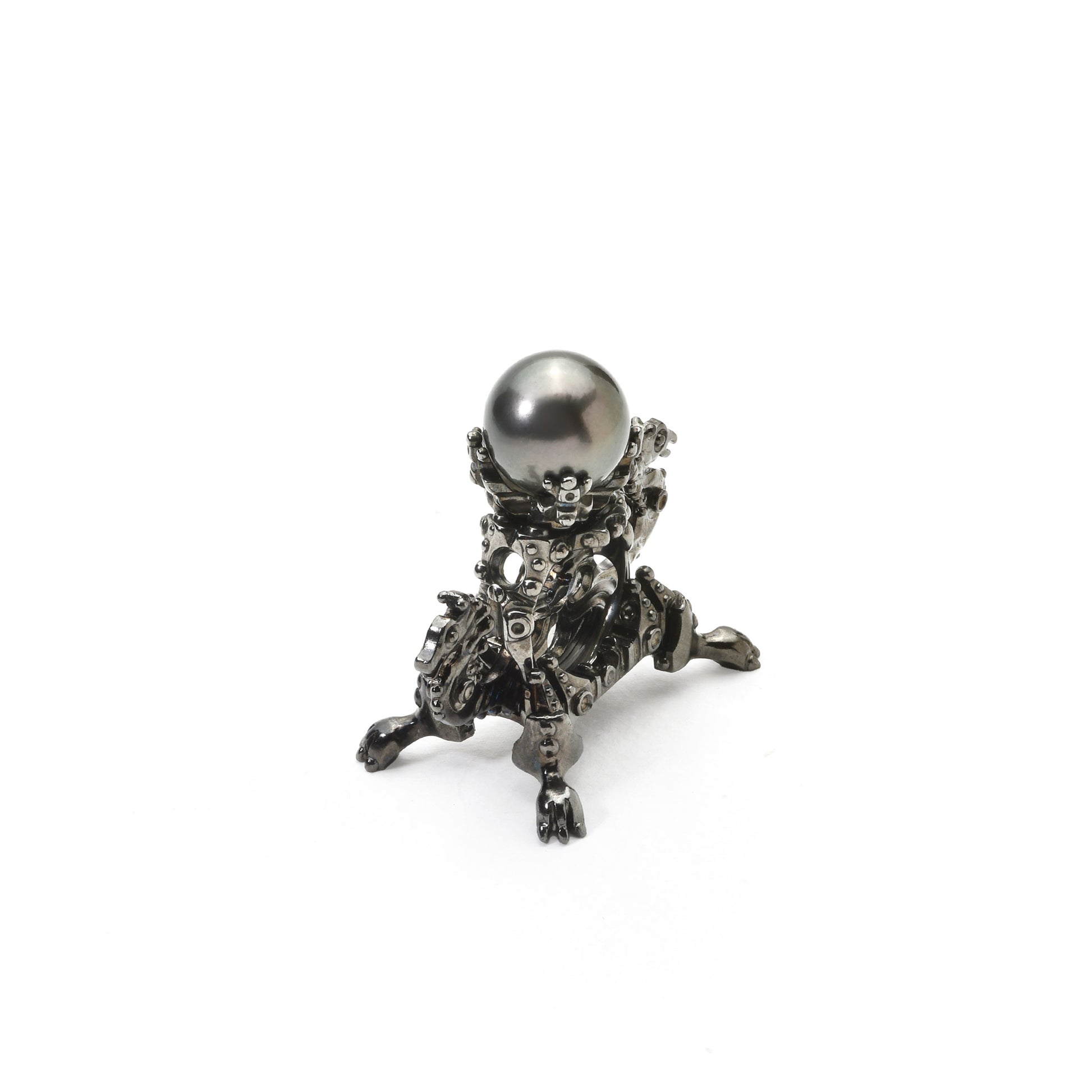 BARTOLOMEO showcases a single, oversized Tahitian pearl encased in a lavishly ornate setting of blackened sterling silver. It comes with an elegant display stand, allowing the ring to double as a sculptural art piece when not worn.