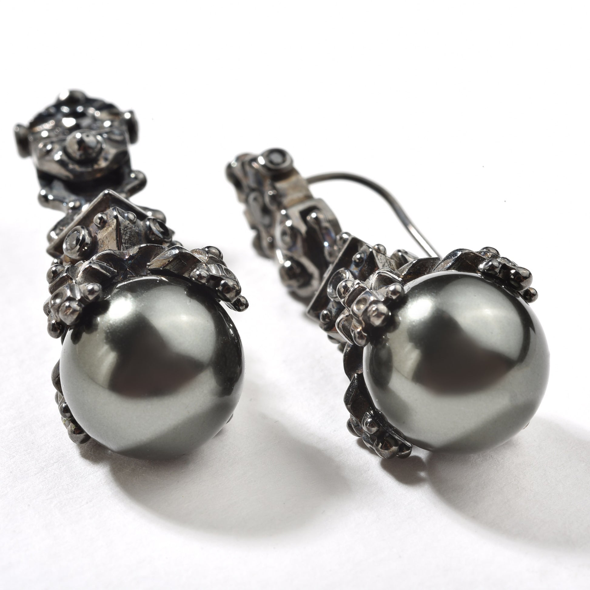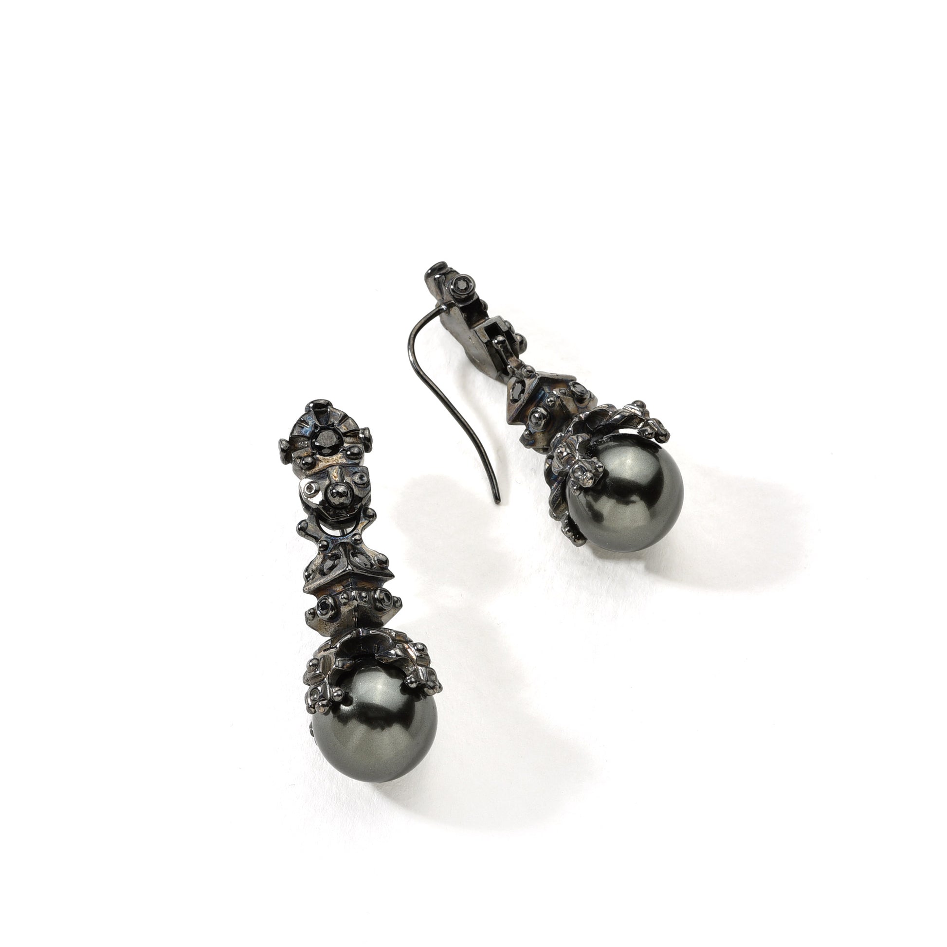 A bold and captivating pairing from our Wilderness Collection: The BARTOLOMEO ring and ELIZABETH earrings are united by their dramatic presence, sculptural form, and rich use of rare materials – from glowing black Tahitian pearls to dark, shimmering diamonds.