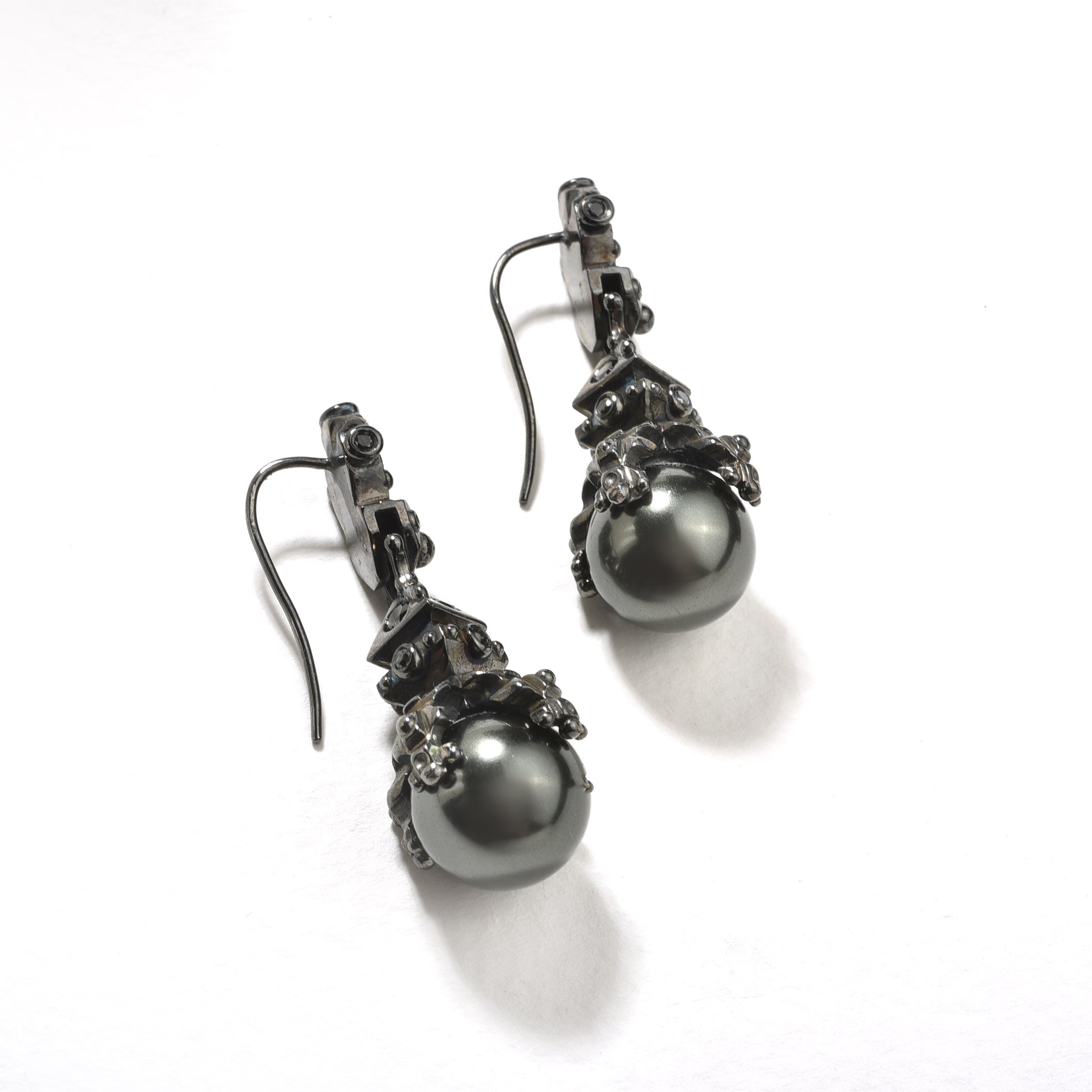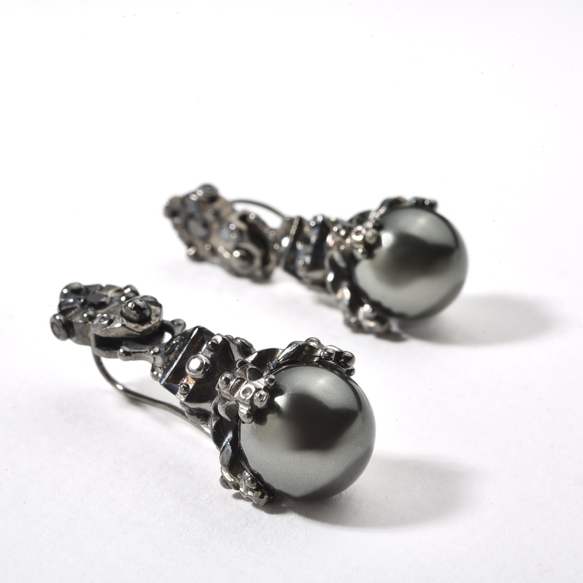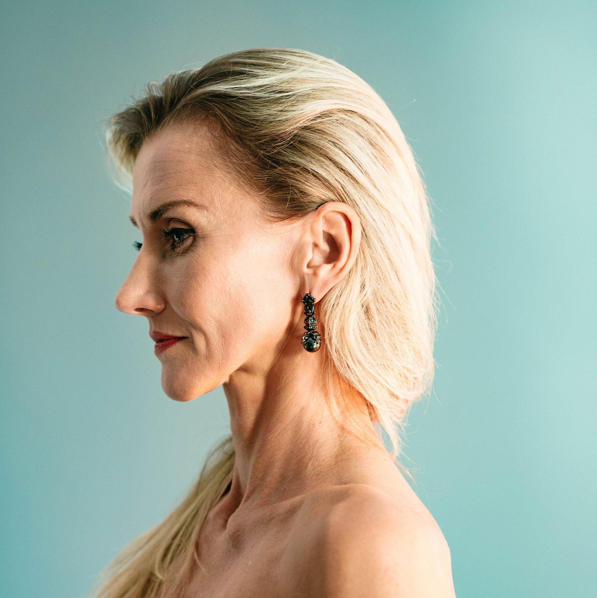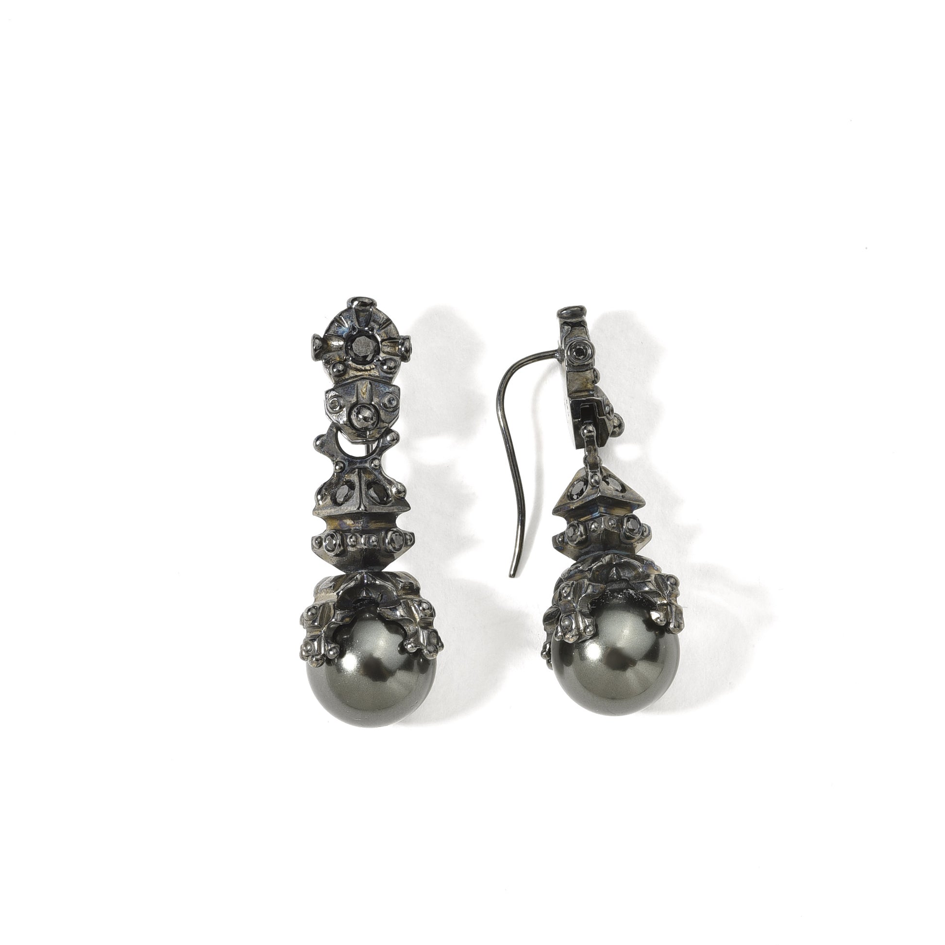 ELIZABETH mirrors this aesthetic in a pair of articulated drop earrings featuring matching large pearls and sparkling black diamonds. Their movement adds depth, mystery, and undeniable elegance.