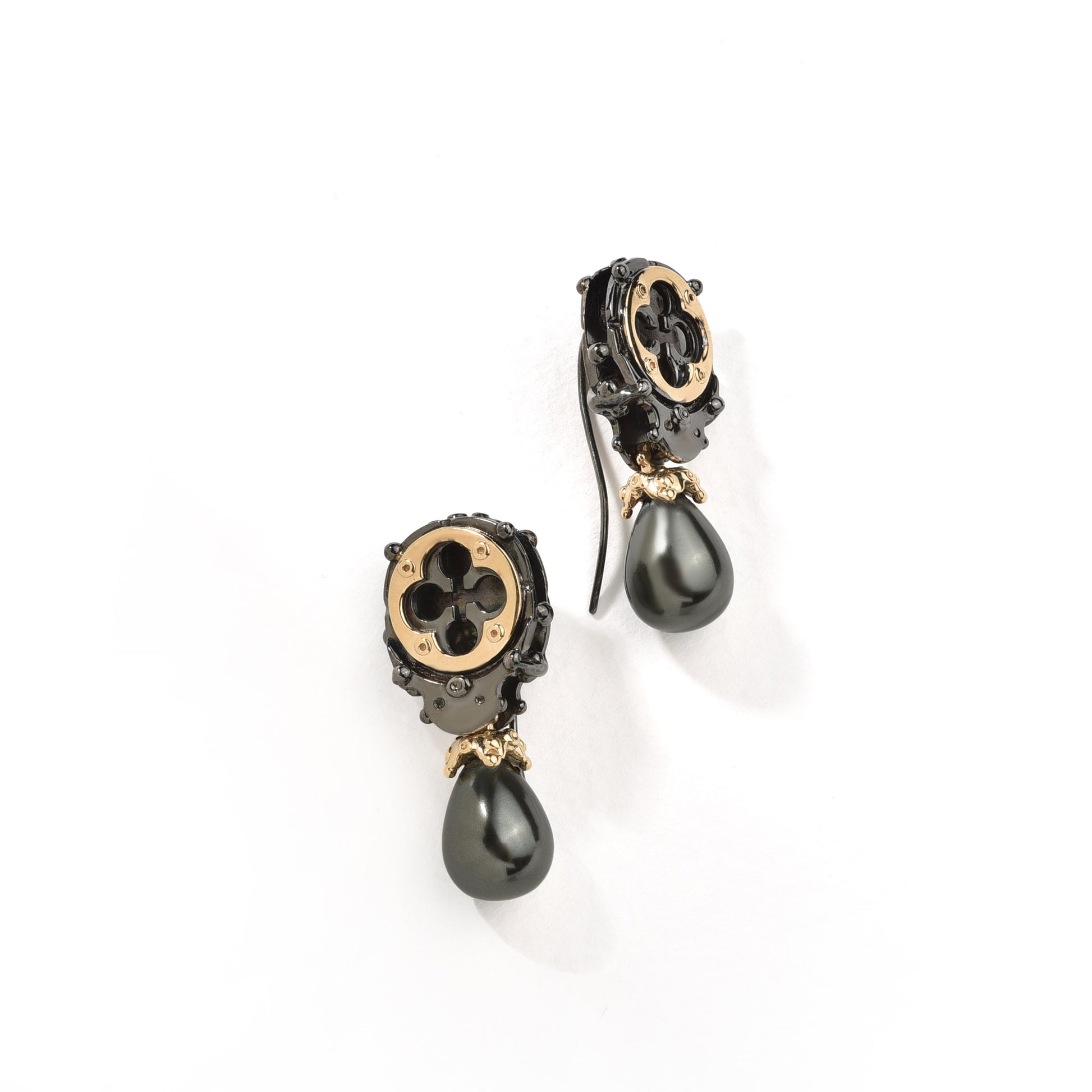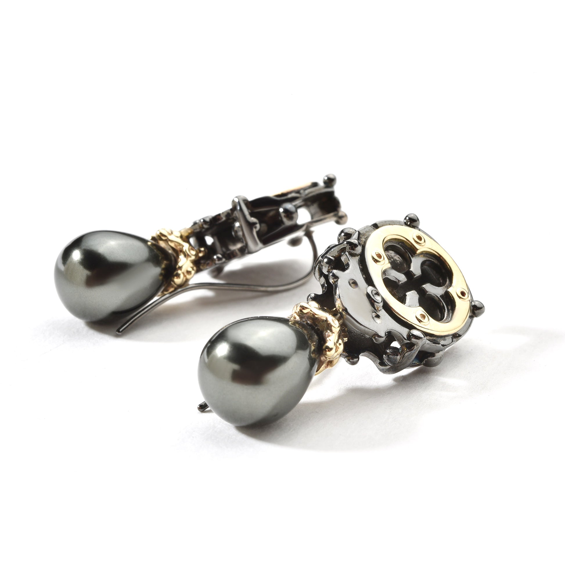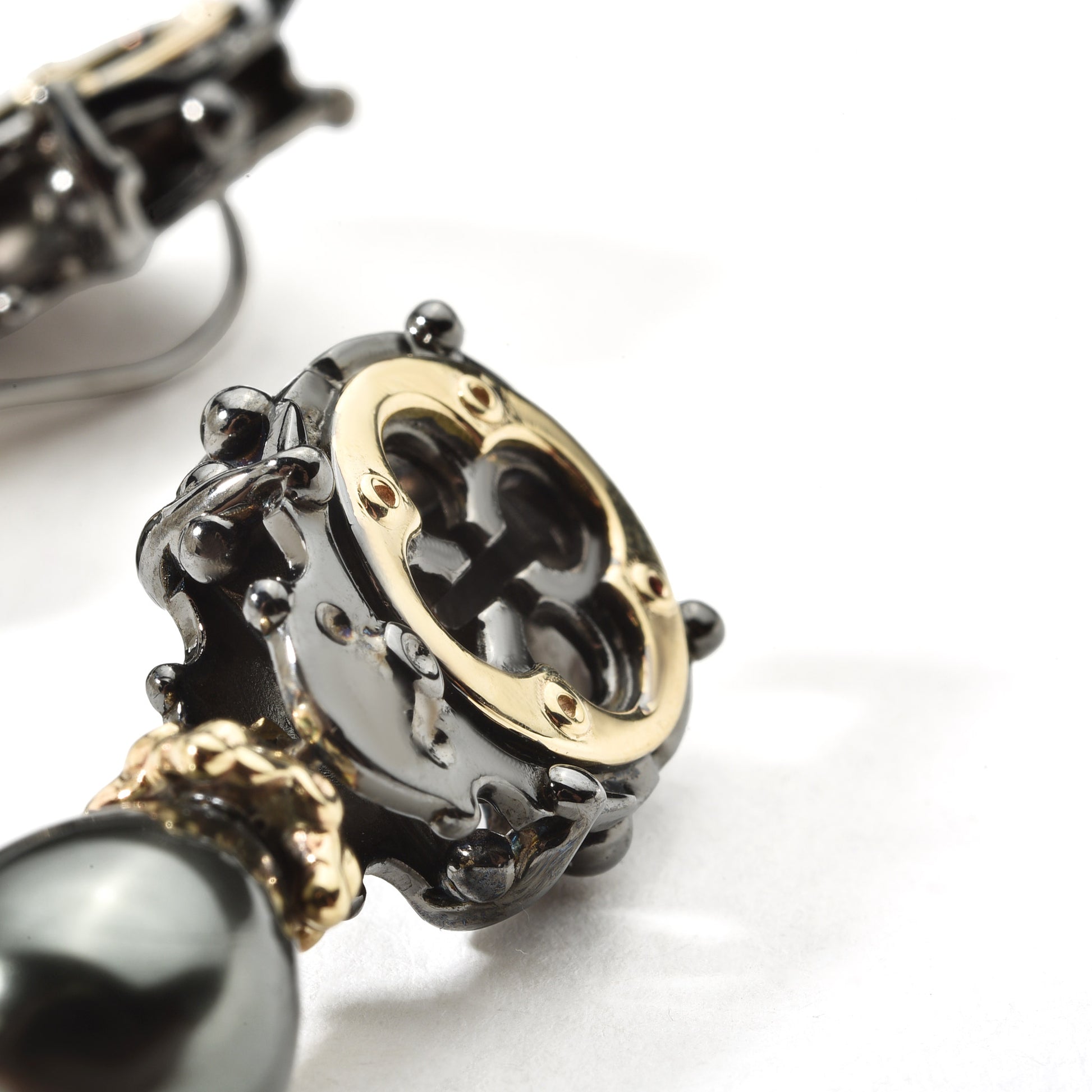 Opulent earrings in fascinating bicolor combination of black rhodium-plated silver and warm yellow gold. The noble black Tahitian pearls in elegant teardrop form set a dramatic accent. The Venetian-baroque design of these opulent pieces of jewelry embodies the luxurious craftsmanship of our collection with unmistakable character.