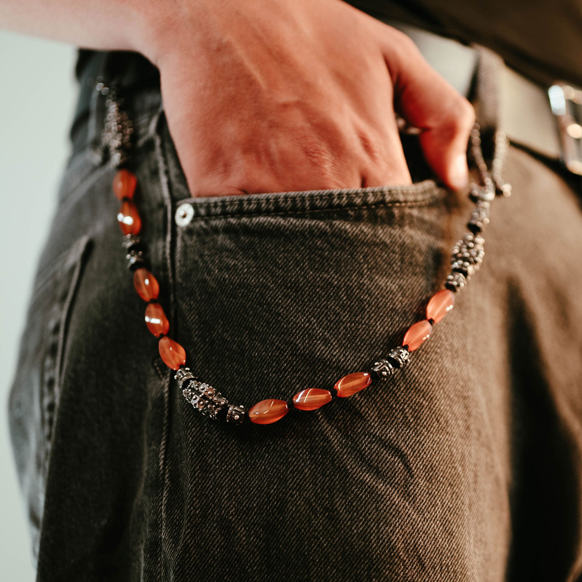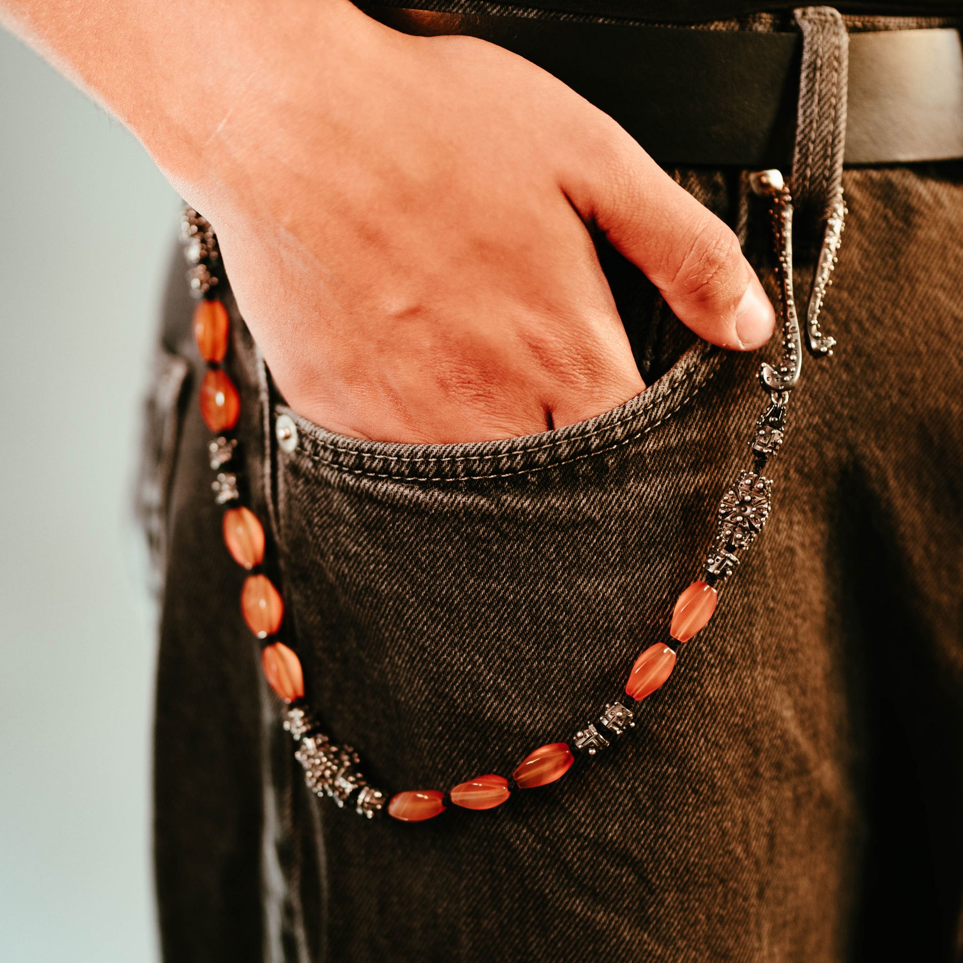 Imposing chain in blackened silver with exquisite carnelians in fancy cut. The massive, heavy execution and practical hook give this statement piece unmistakable character. Versatile as distinctive vest chain, characterful trouser chain, or noble key chain for bags. The contrasting combination of dark silver and vibrant carnelians reflects the dramatic opulence of our Baroque collection.