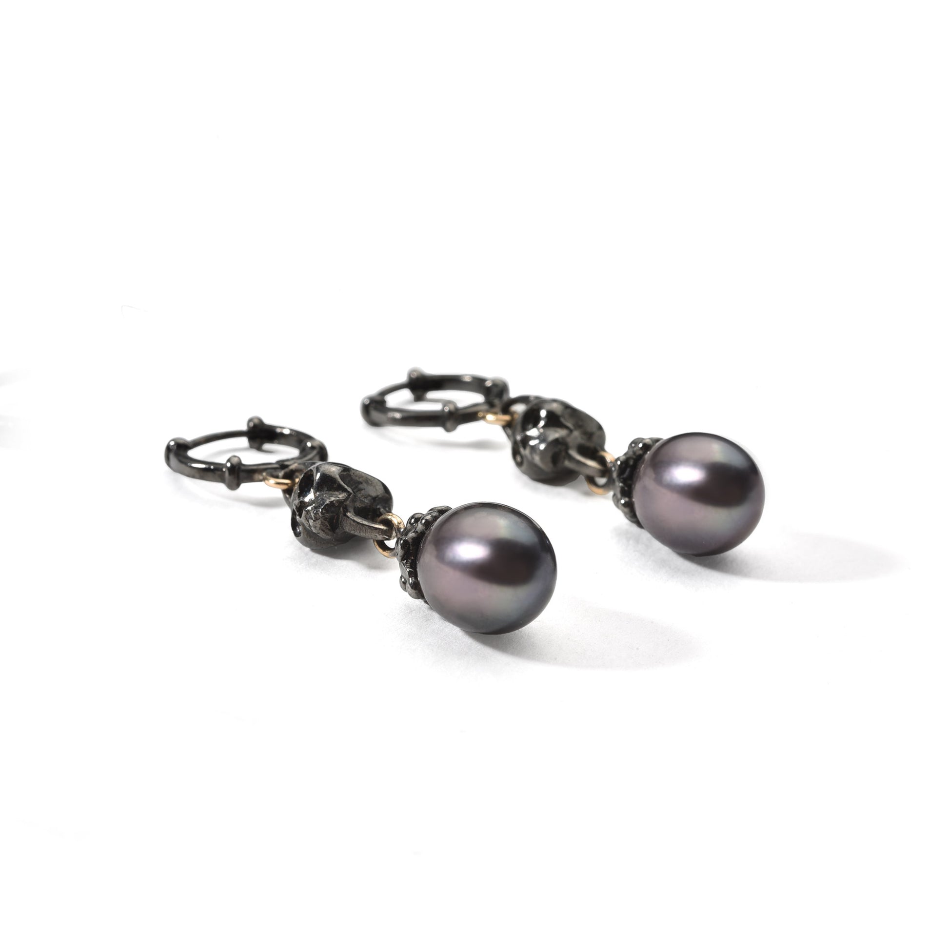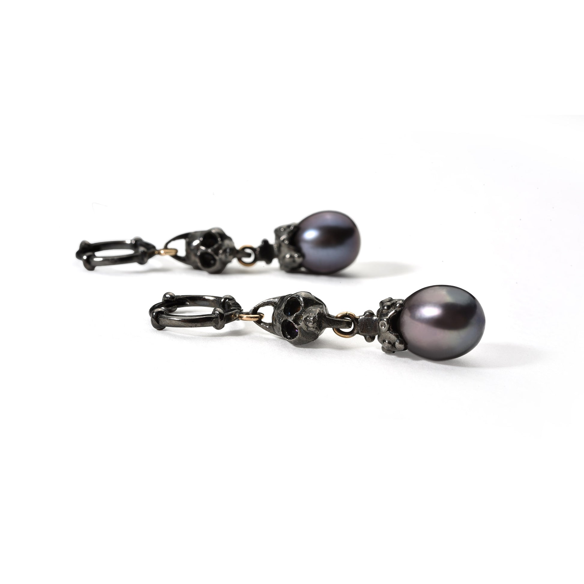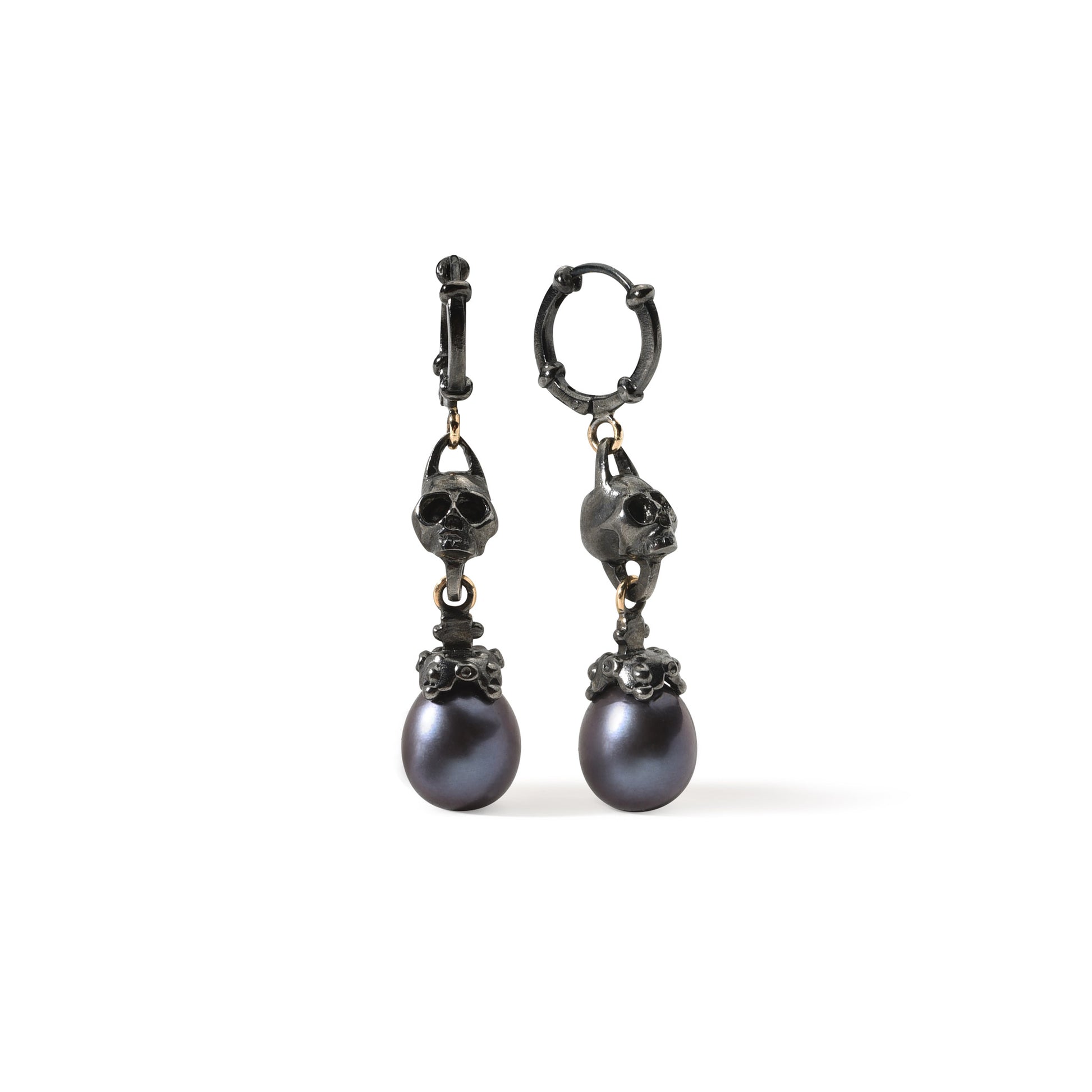 Both pieces feature sculptural skull details paired with elegant black drop pearls. The black rhodium finish enhances their dramatic character, while ORAZIA’s combination of blackened silver and golden loops adds contrast and depth. The articulated design of the earrings brings movement and lightness to this otherwise bold composition.