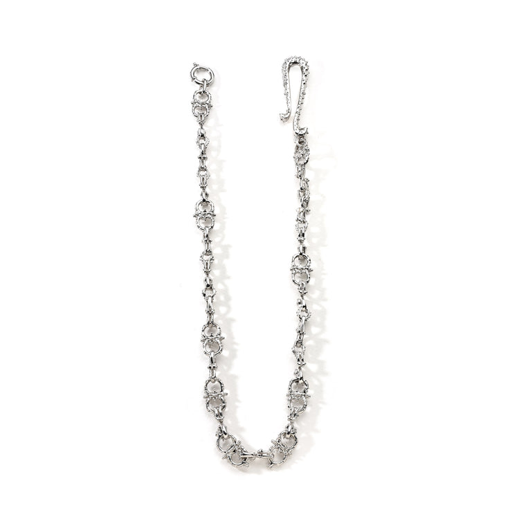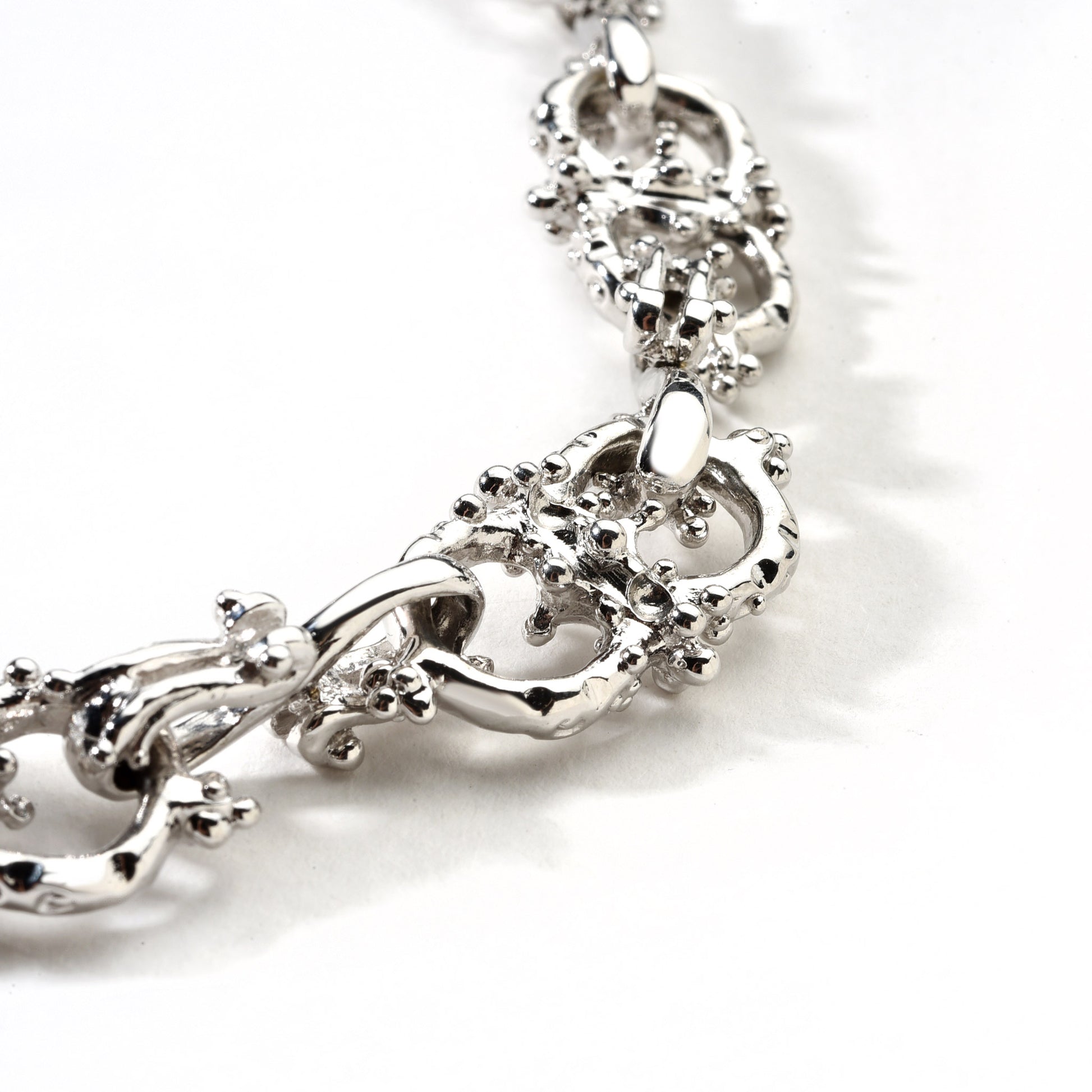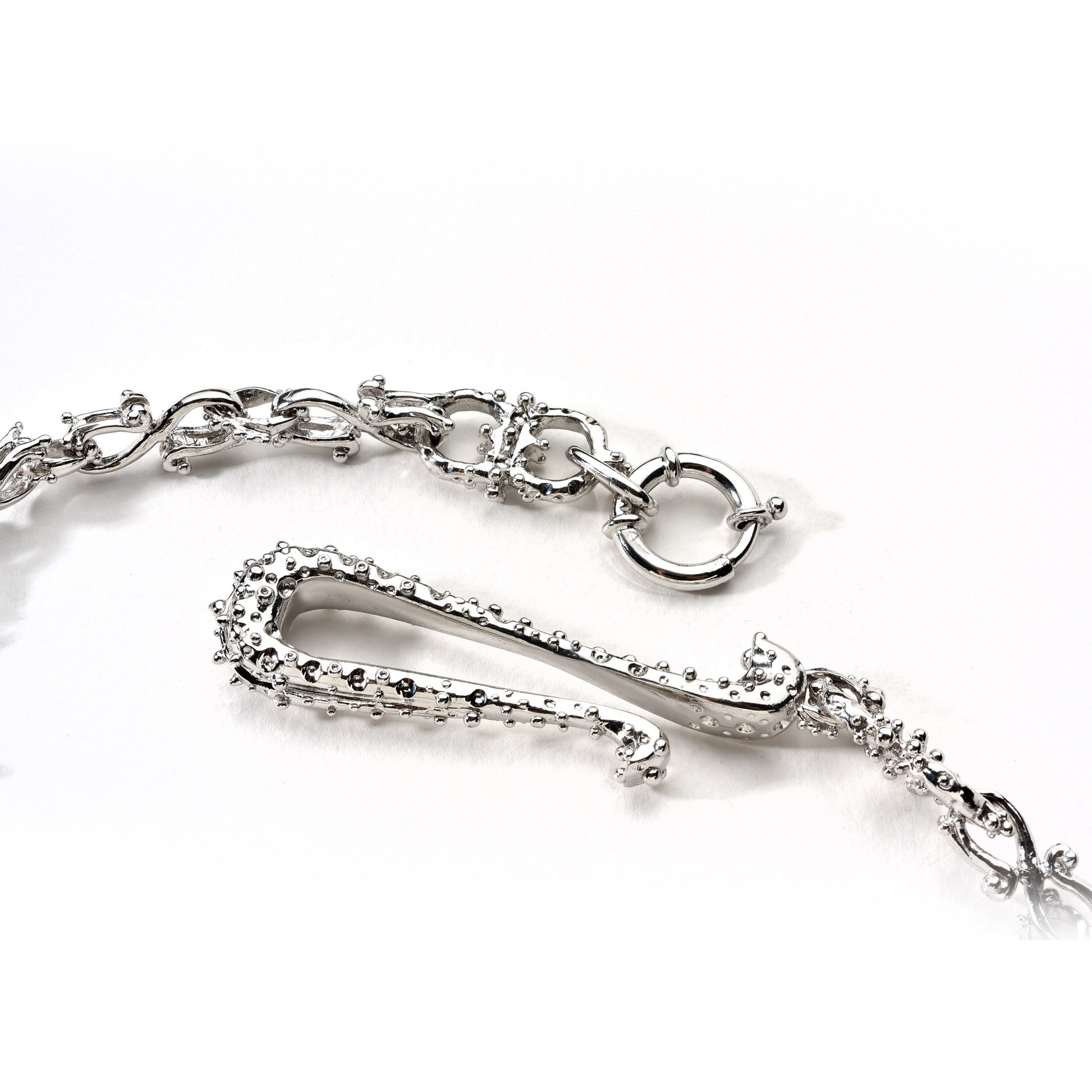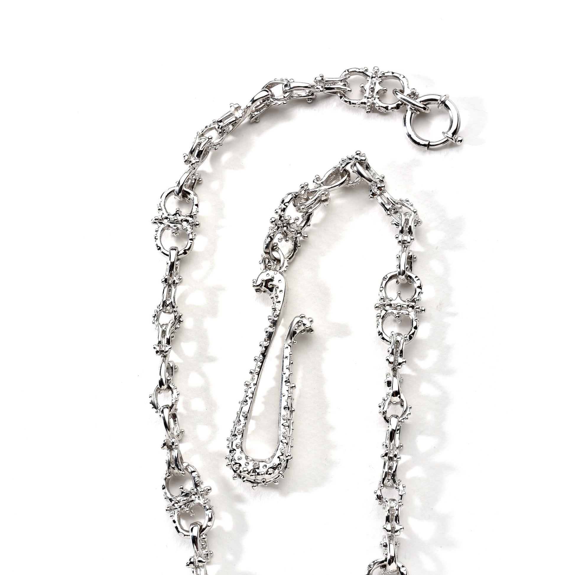 Magnificent chain in rhodium-plated silver with lavish baroque decorations and playful details. The generous length and practical hook make this luxurious accessory versatile – whether as elegant vest chain, distinctive trouser chain, or extravagant bag chain. The masterful craftsmanship and richly detailed design reflect the opulent aesthetics of our Baroque collection.