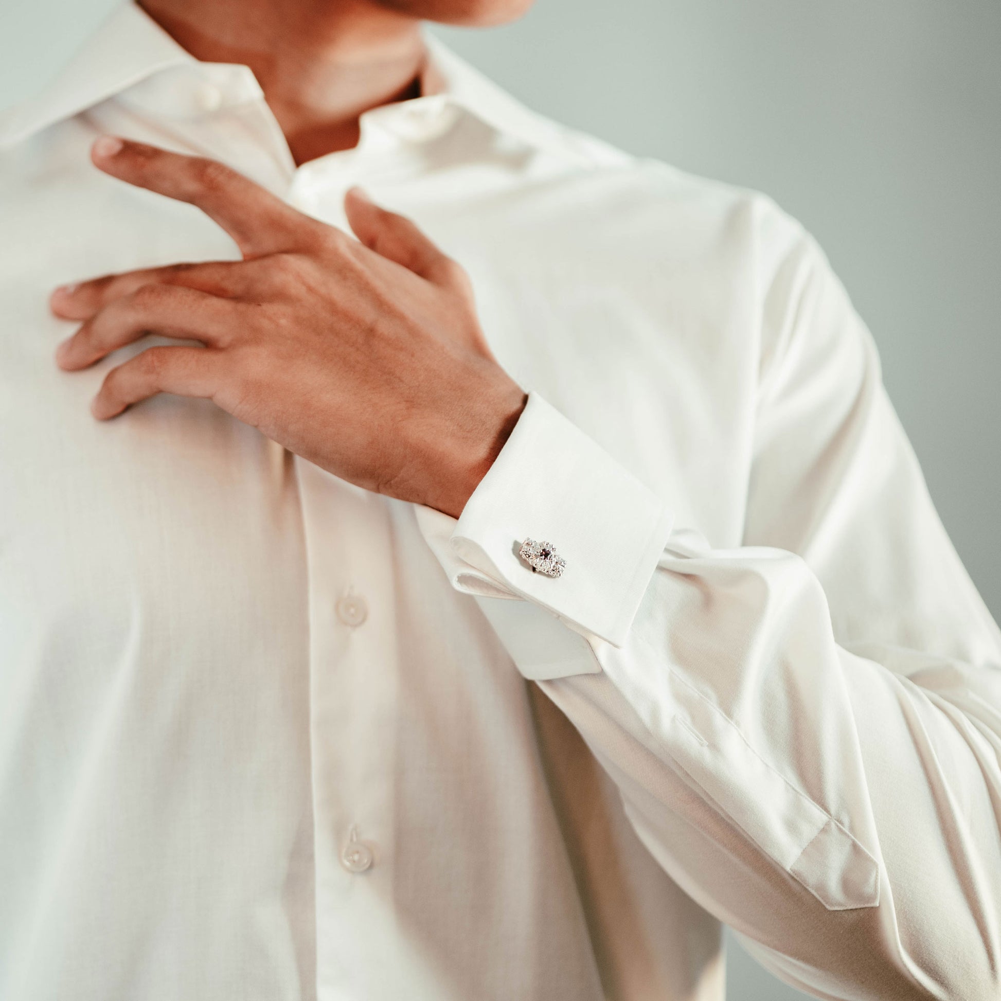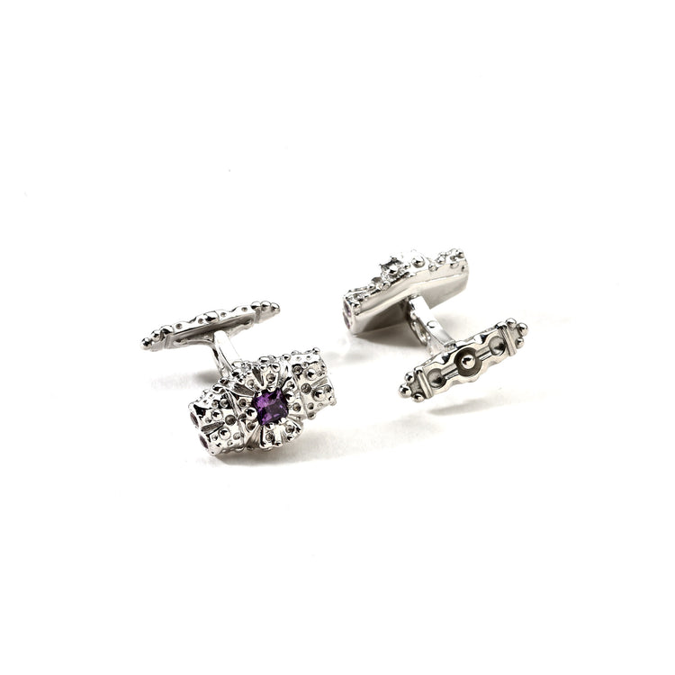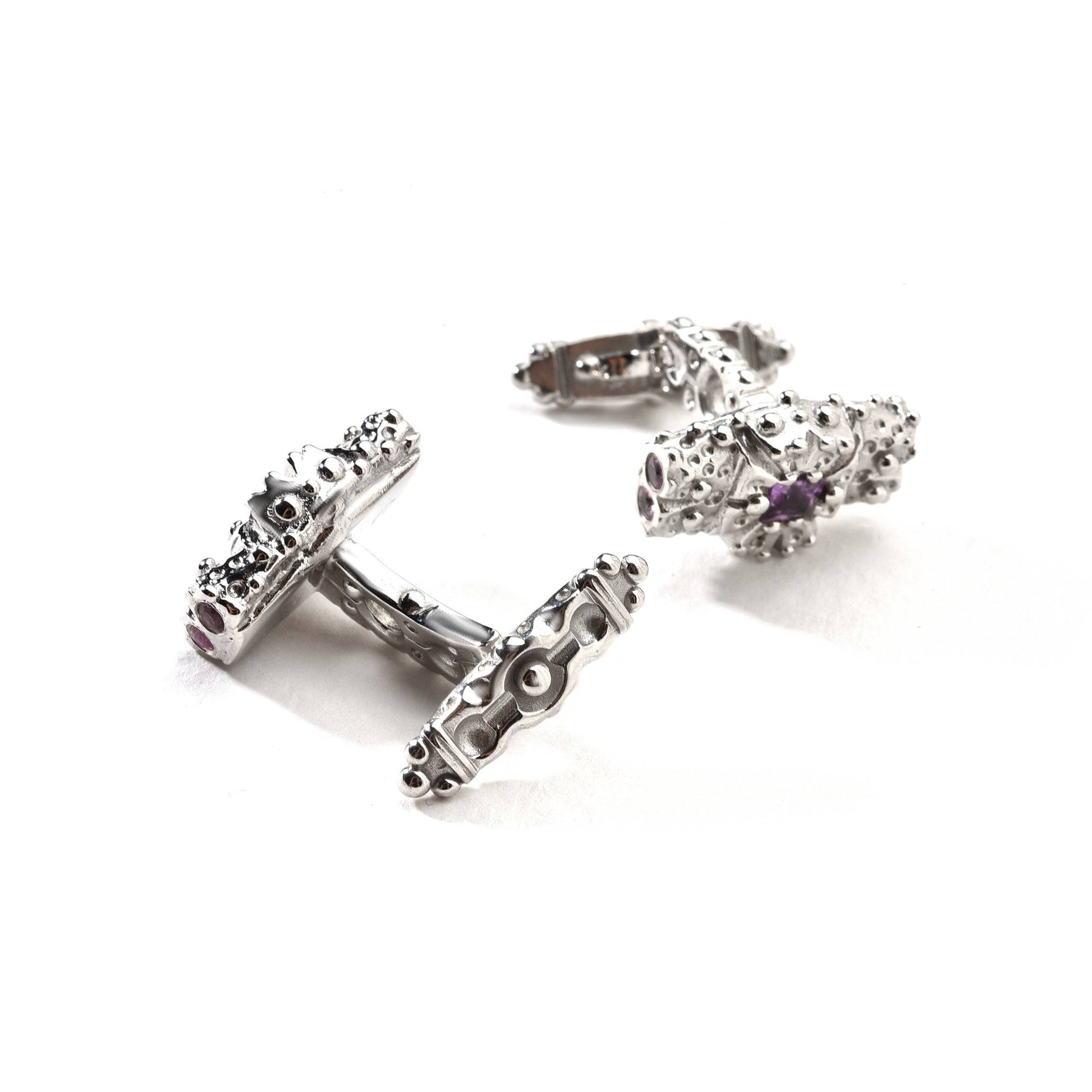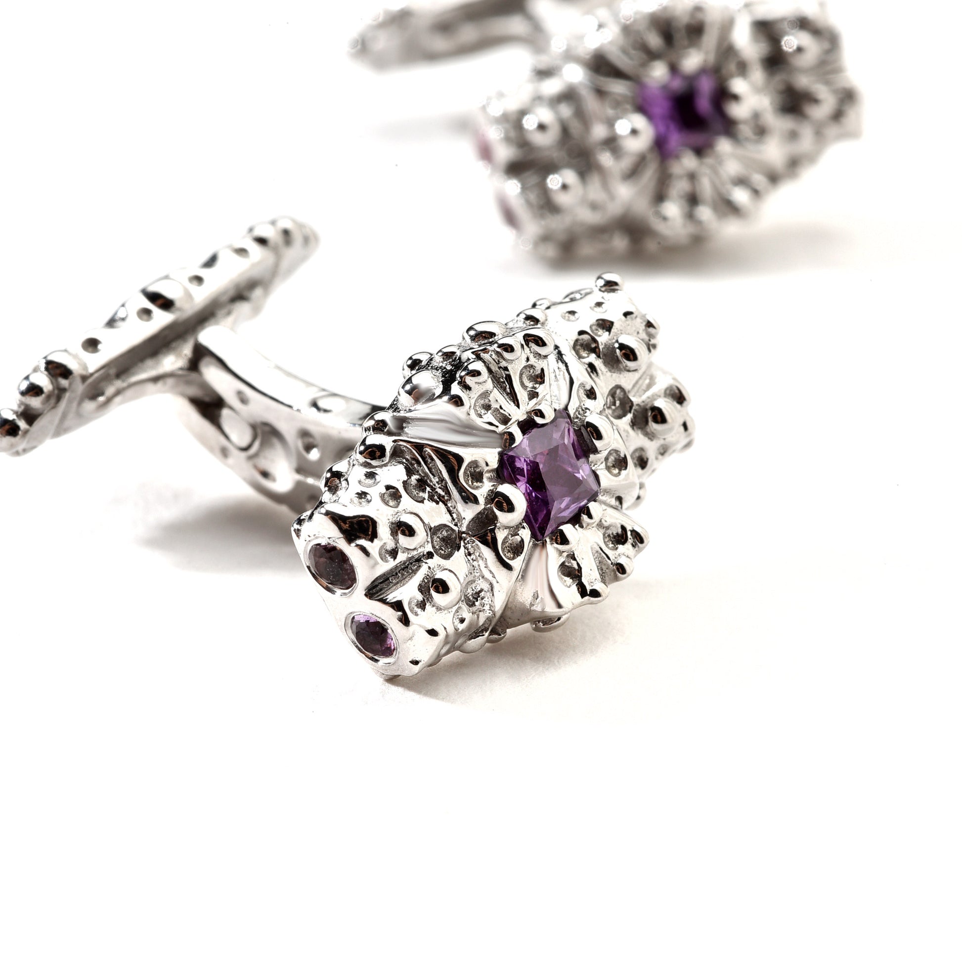 Elegant cufflinks with noble purple sapphires in exclusive Princess Cut as centerstone, surrounded by sparkling pink sapphires. The elaborate rhodium-plated silver setting with baroque decorations perfectly emphasizes the precious gemstones. A luxurious accessory from our collection that impresses with its opulent coloration and masterful craftsmanship.