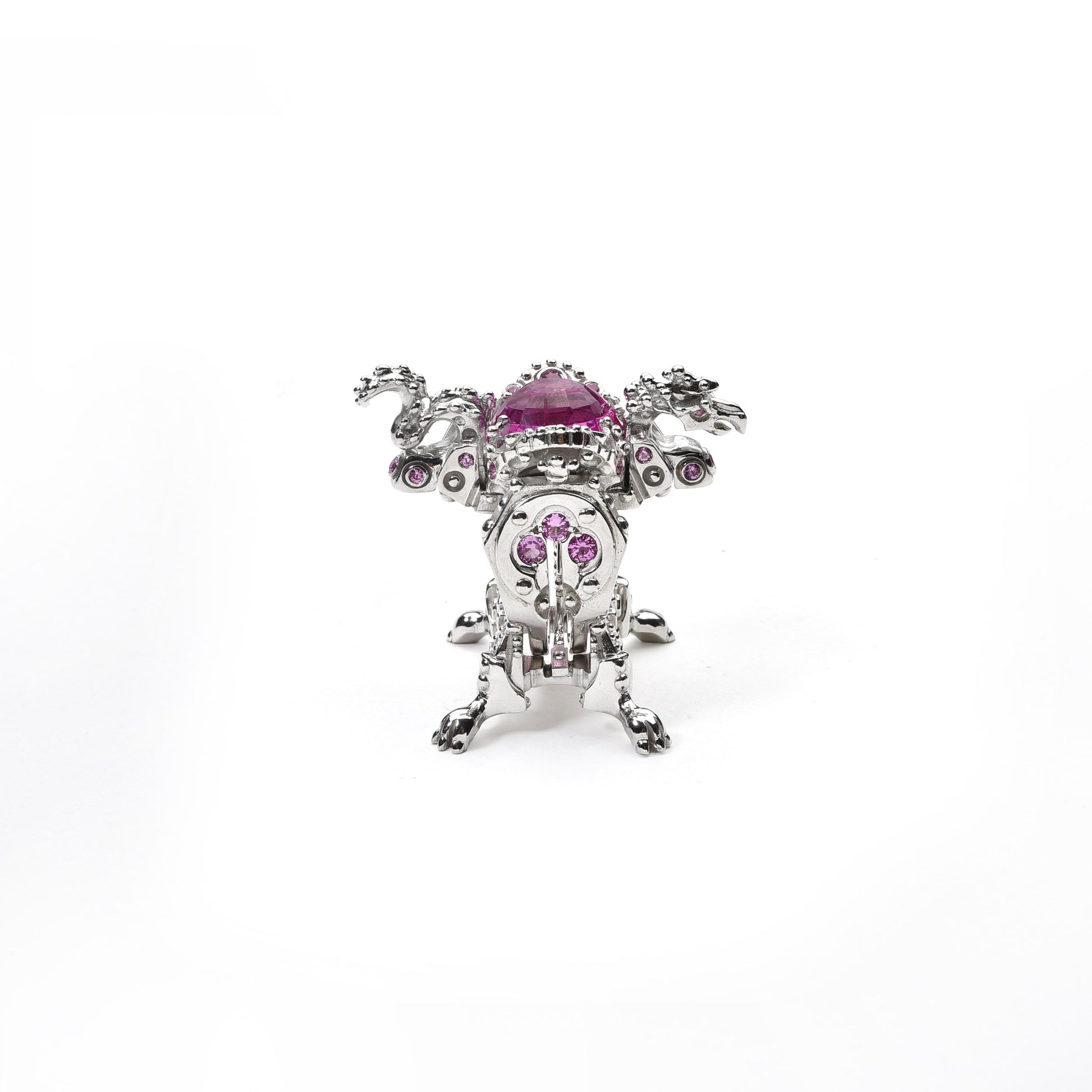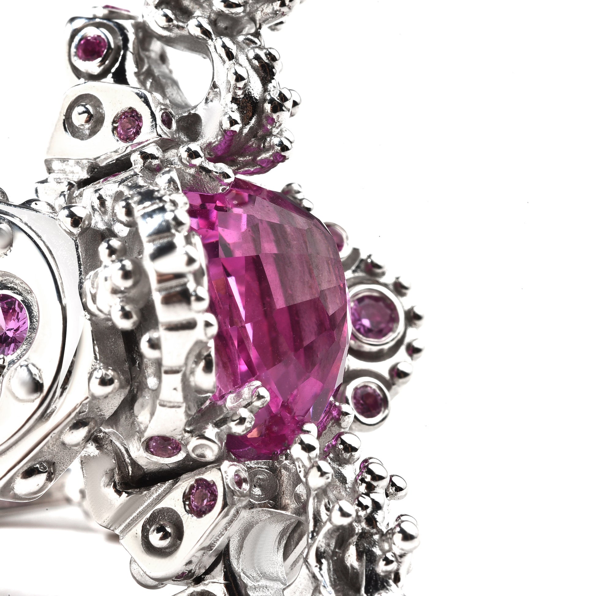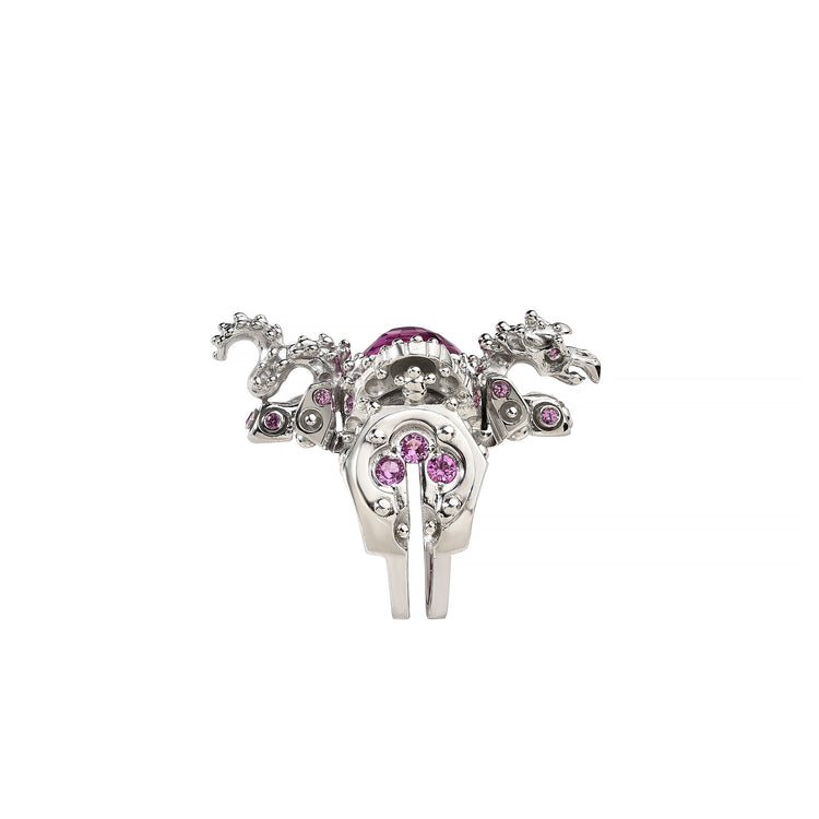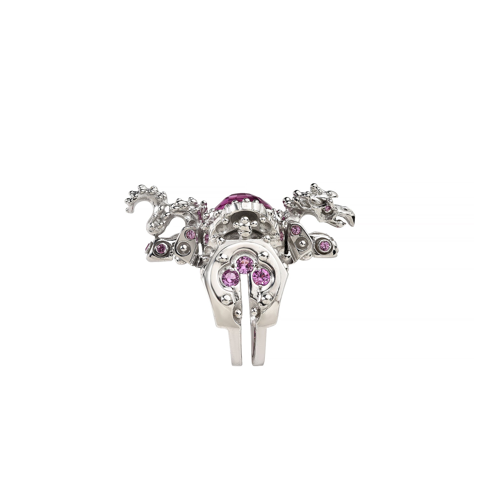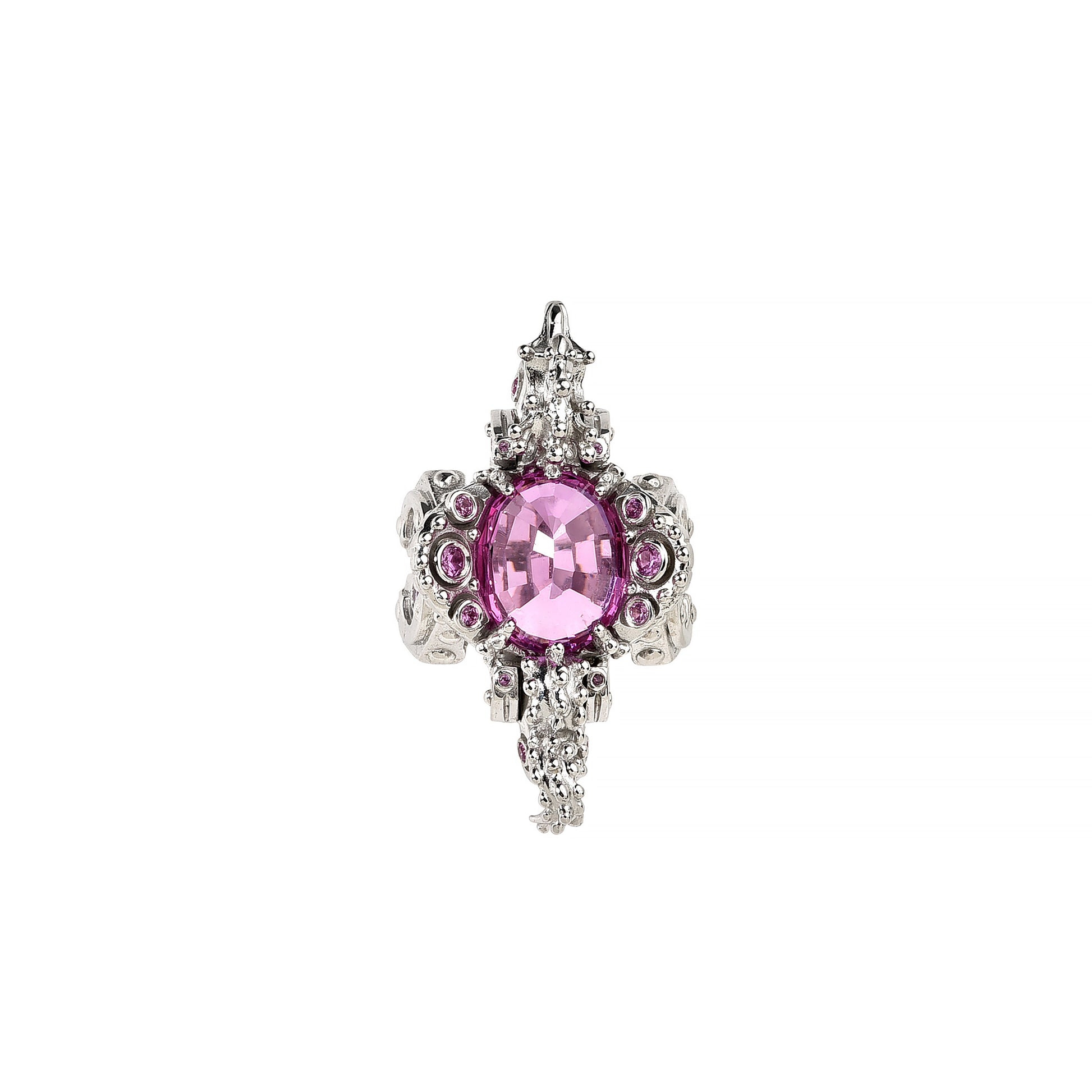 Very opulent figurative dragon ring with impressive pink topaz as centerstone and sparkling pink sapphires. The detailed design embodies the baroque opulence of our collection.
