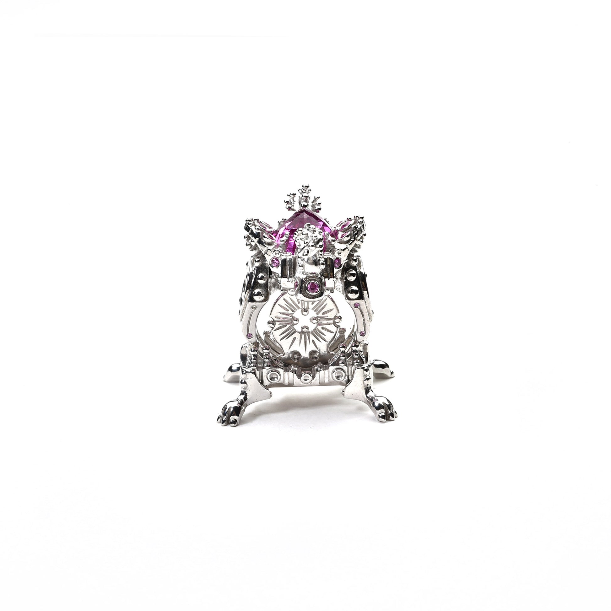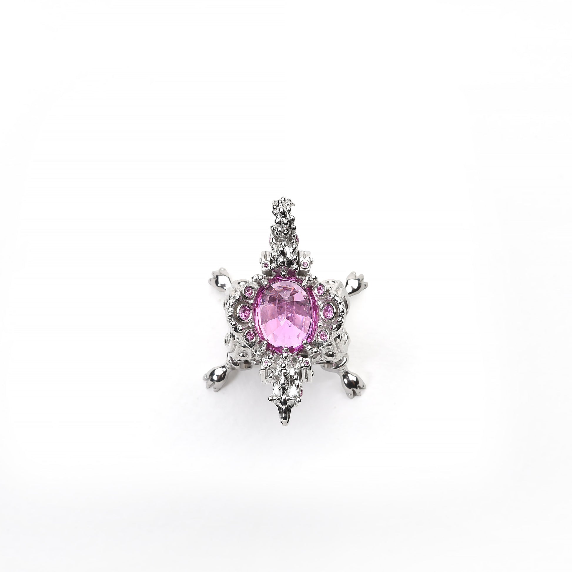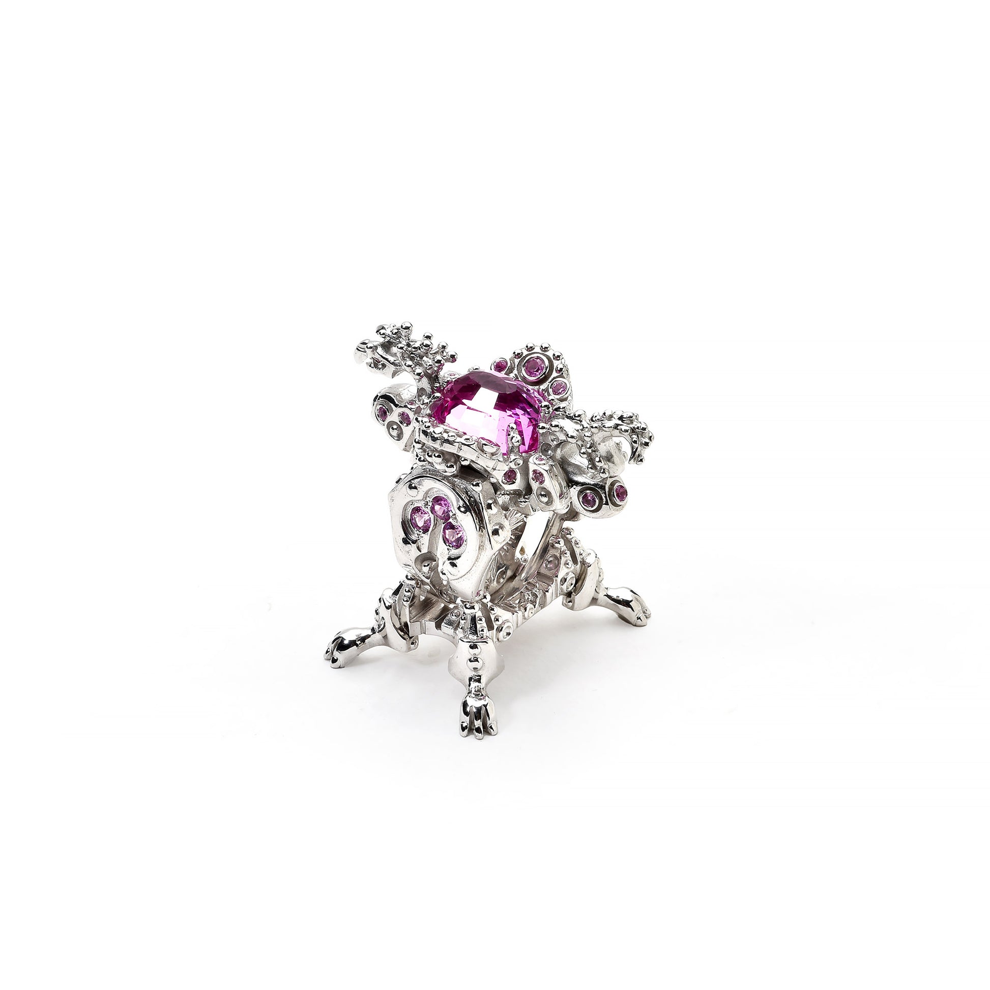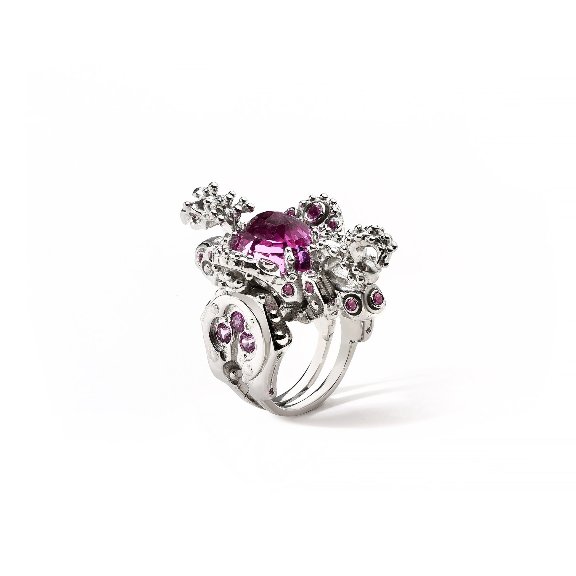 Very opulent figurative dragon ring with impressive pink topaz as centerstone and sparkling pink sapphires. The detailed design embodies the baroque opulence of our collection.