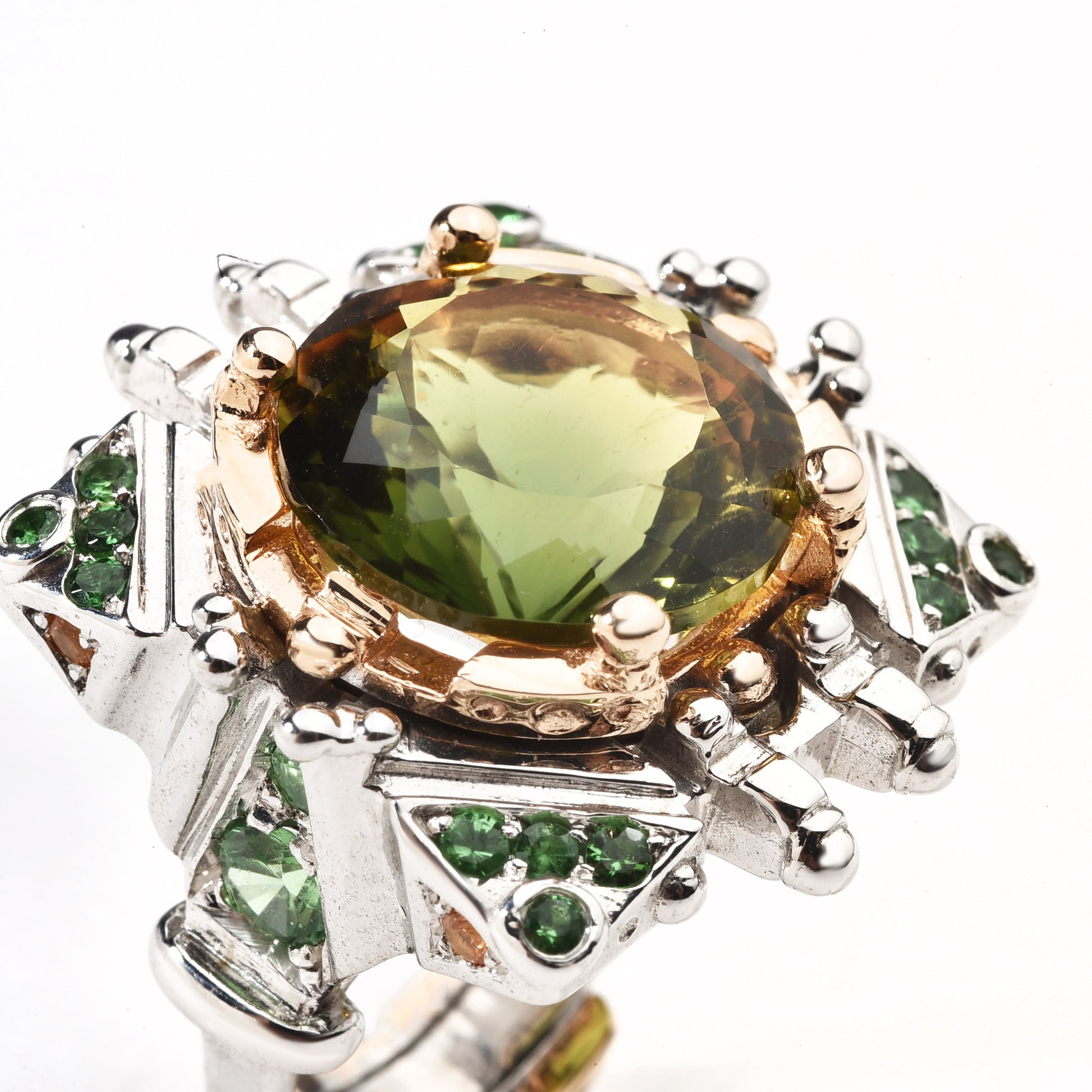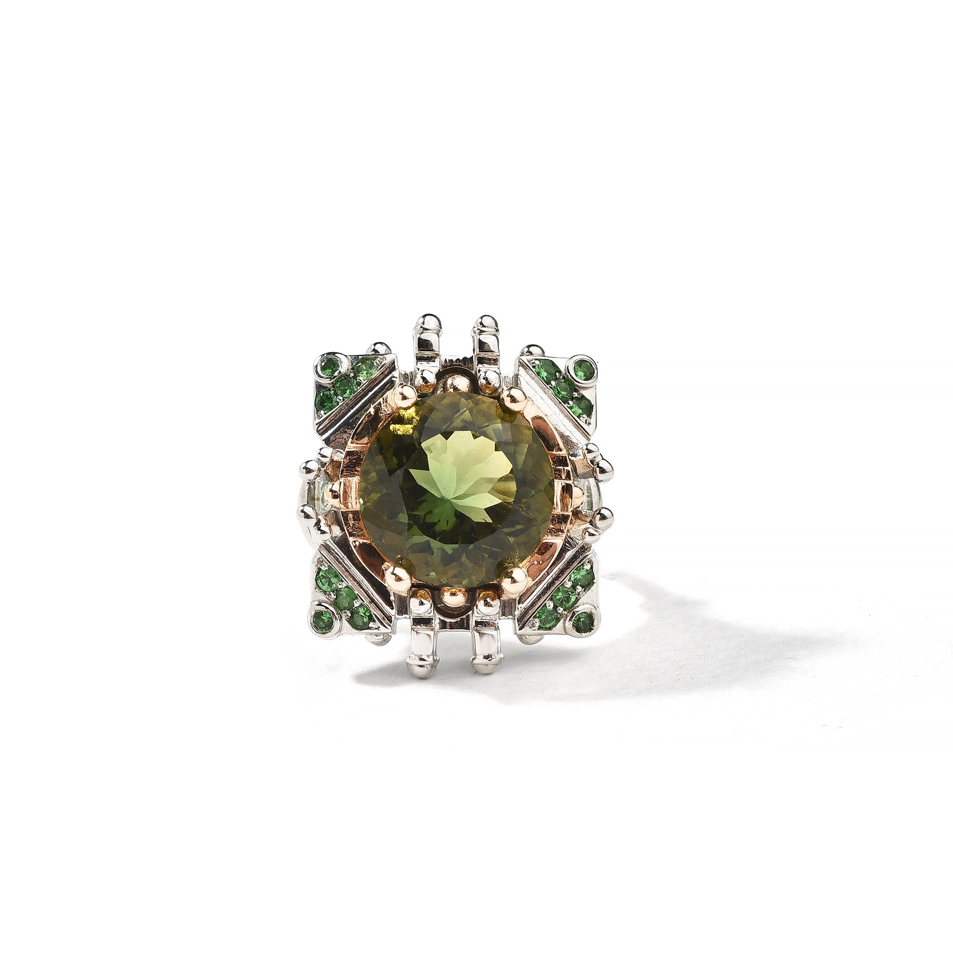 - Gemstones: Yellow-green changing tourmaline (centerstone) and tsavorites