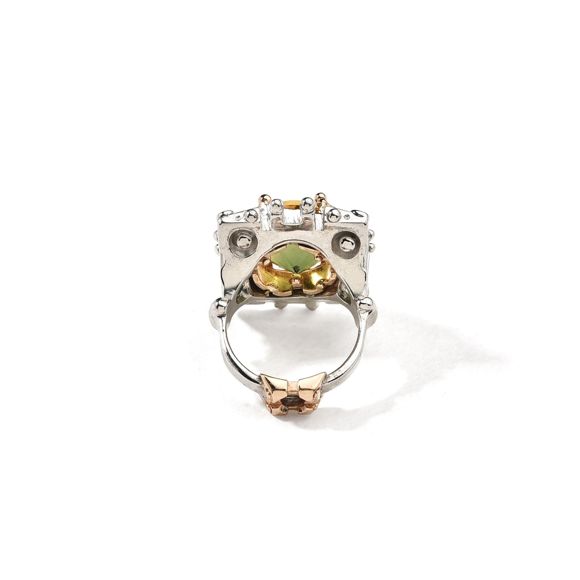 Opulent, massive ring with angular form and a fascinating yellow-green color-changing tourmaline as centerstone. The additional tsavorites underscore the luxurious character of this impressive piece of jewelry. A majestic highlight from our Baroque collection with powerful presence.