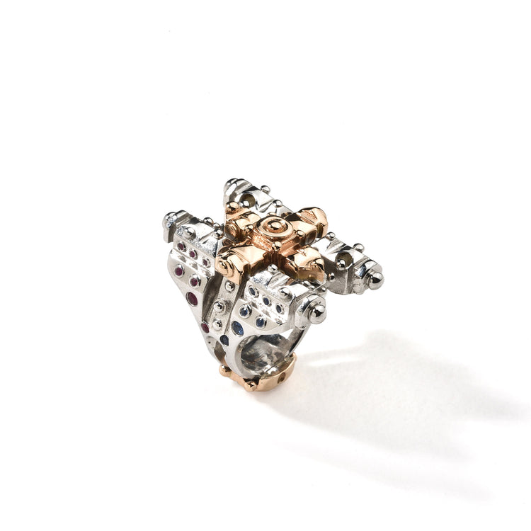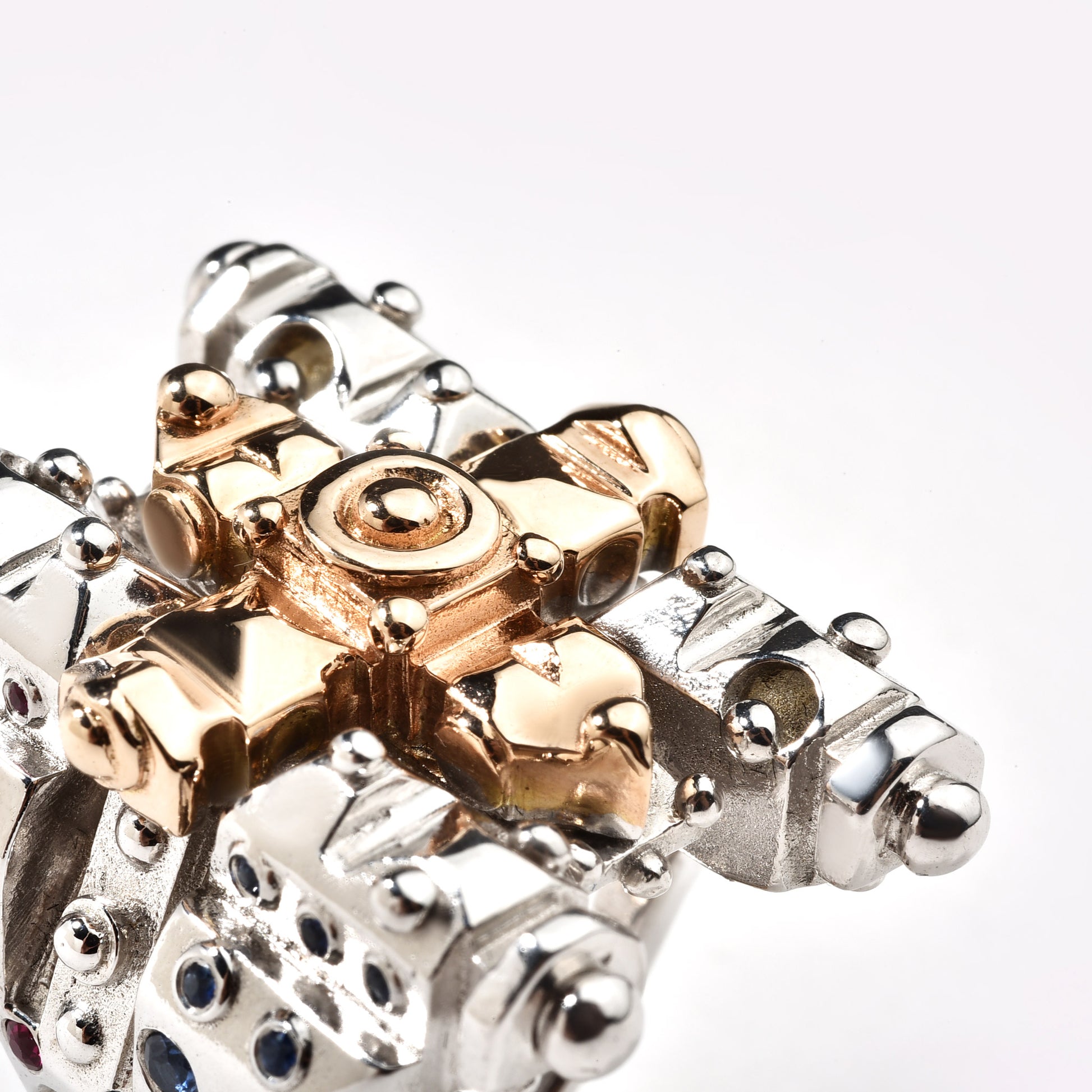 Massive, opulent bicolor ring with luminous red and blue sapphires. The contrasting gemstones are embedded in a magnificent, baroque setting. An extraordinary statement piece from our collection that impresses with its powerful presence and masterful craftsmanship.