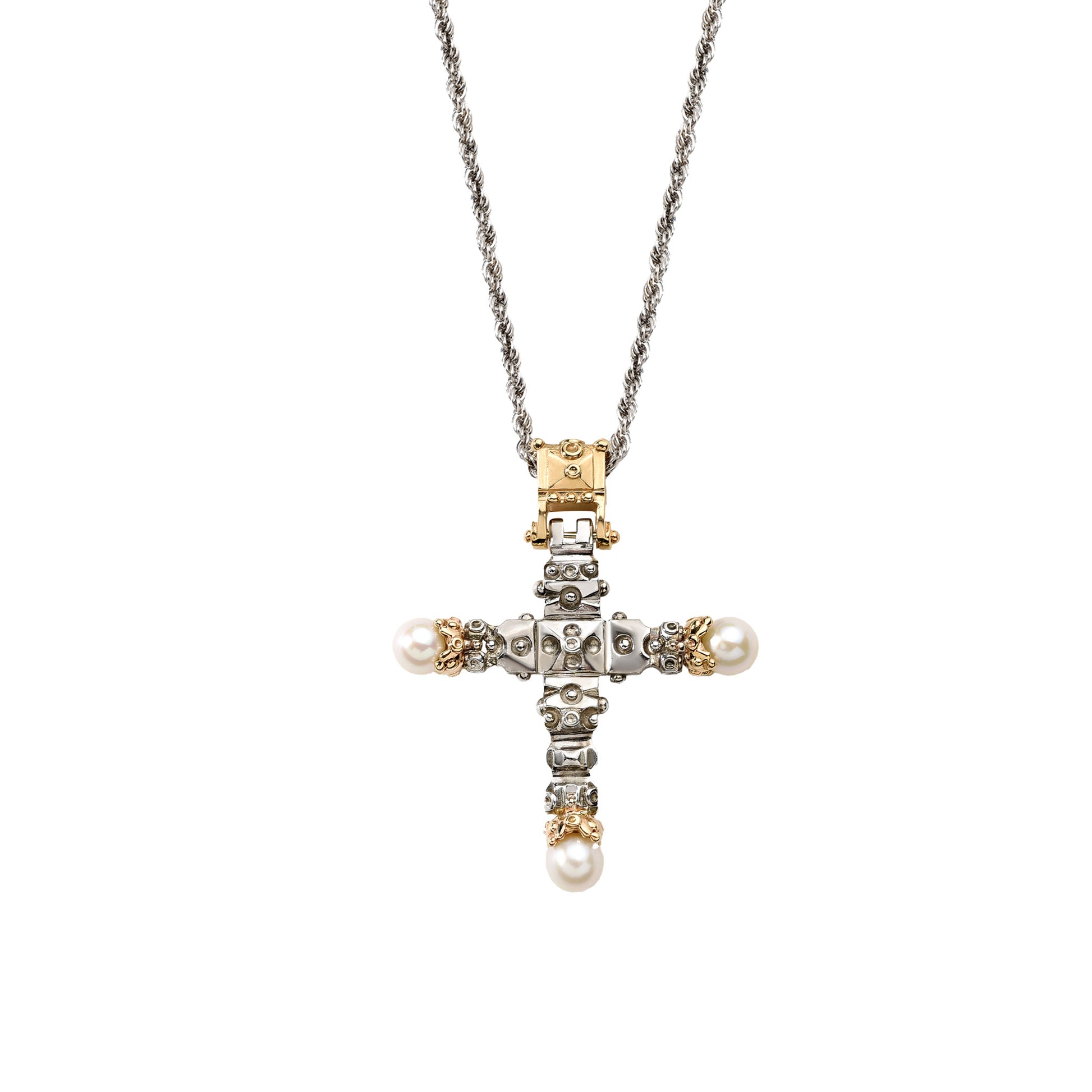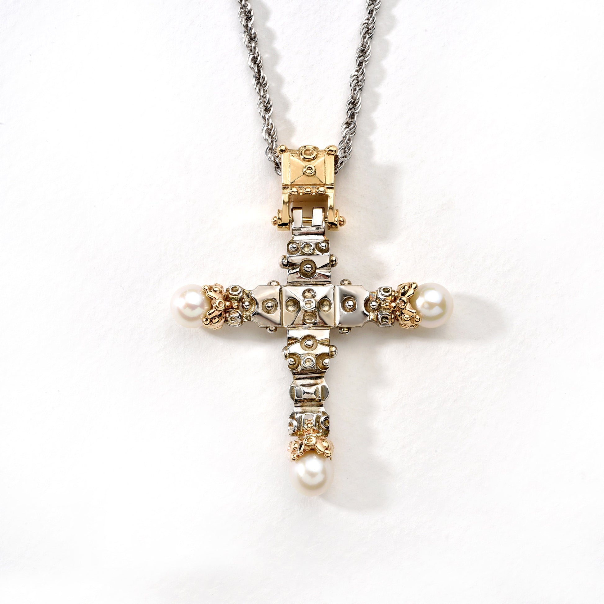 Massive cross pendant in luxurious material combination. The harmonious blend of silver, warm yellow gold, and shimmering freshwater pearls underscores the opulent character of our Baroque collection. A powerful statement piece with timeless radiance.