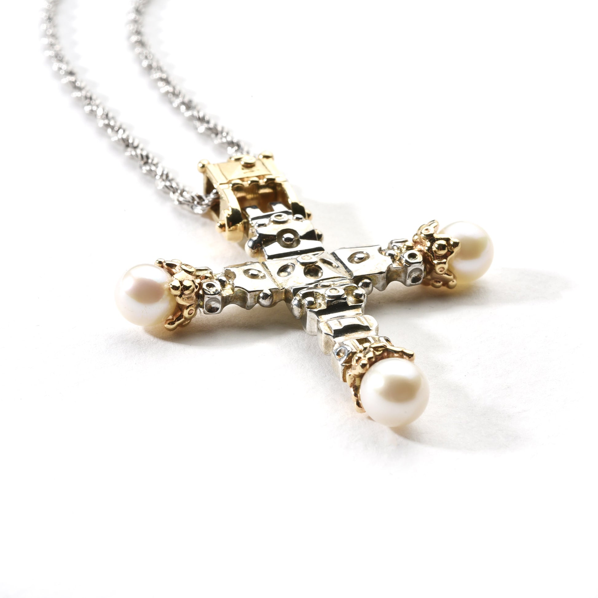 SACRATI is a powerful statement piece, crafted in a luxurious mix of sterling silver, warm 14k yellow gold, and luminous white freshwater pearls – a radiant interpretation of the cross as both ornament and symbol.