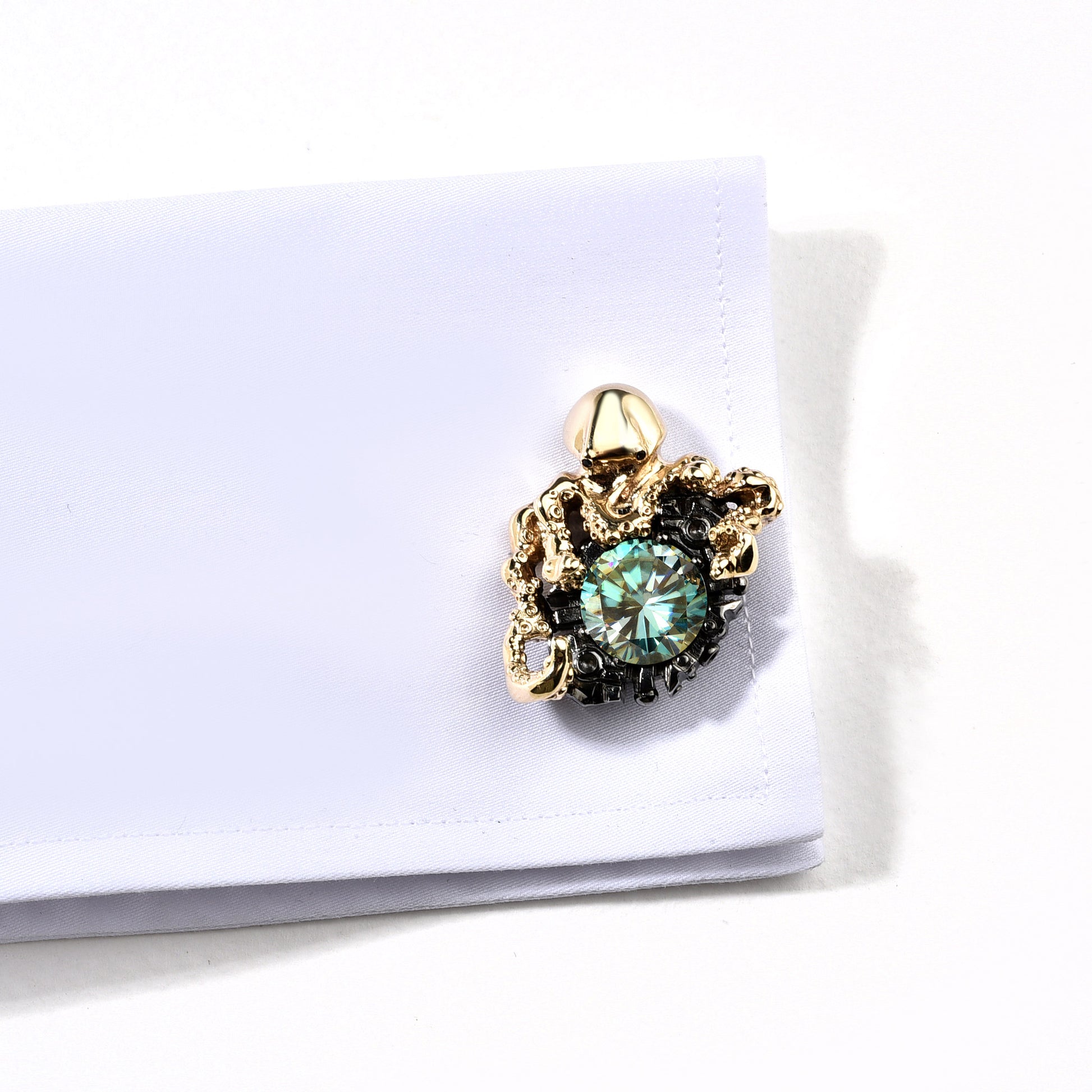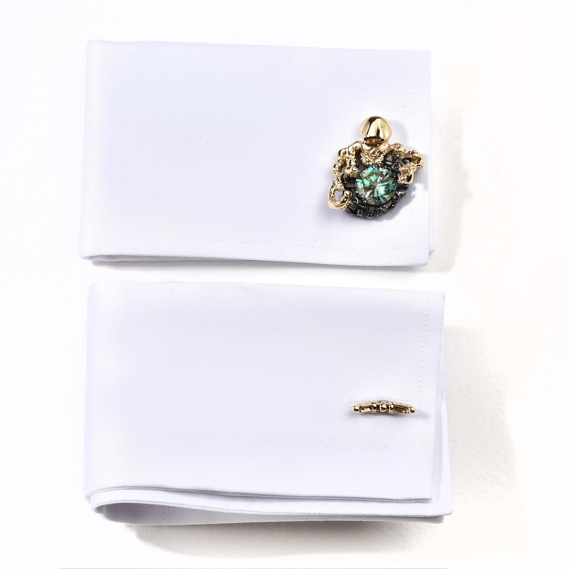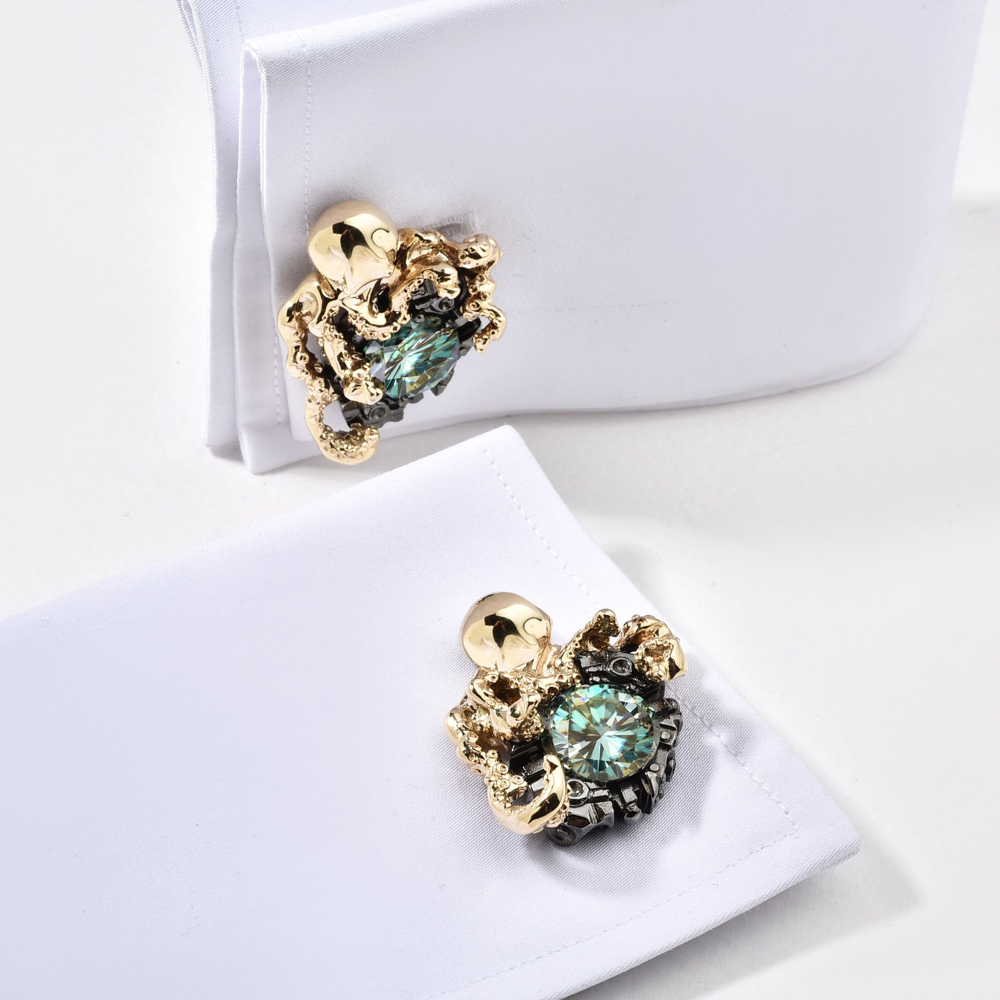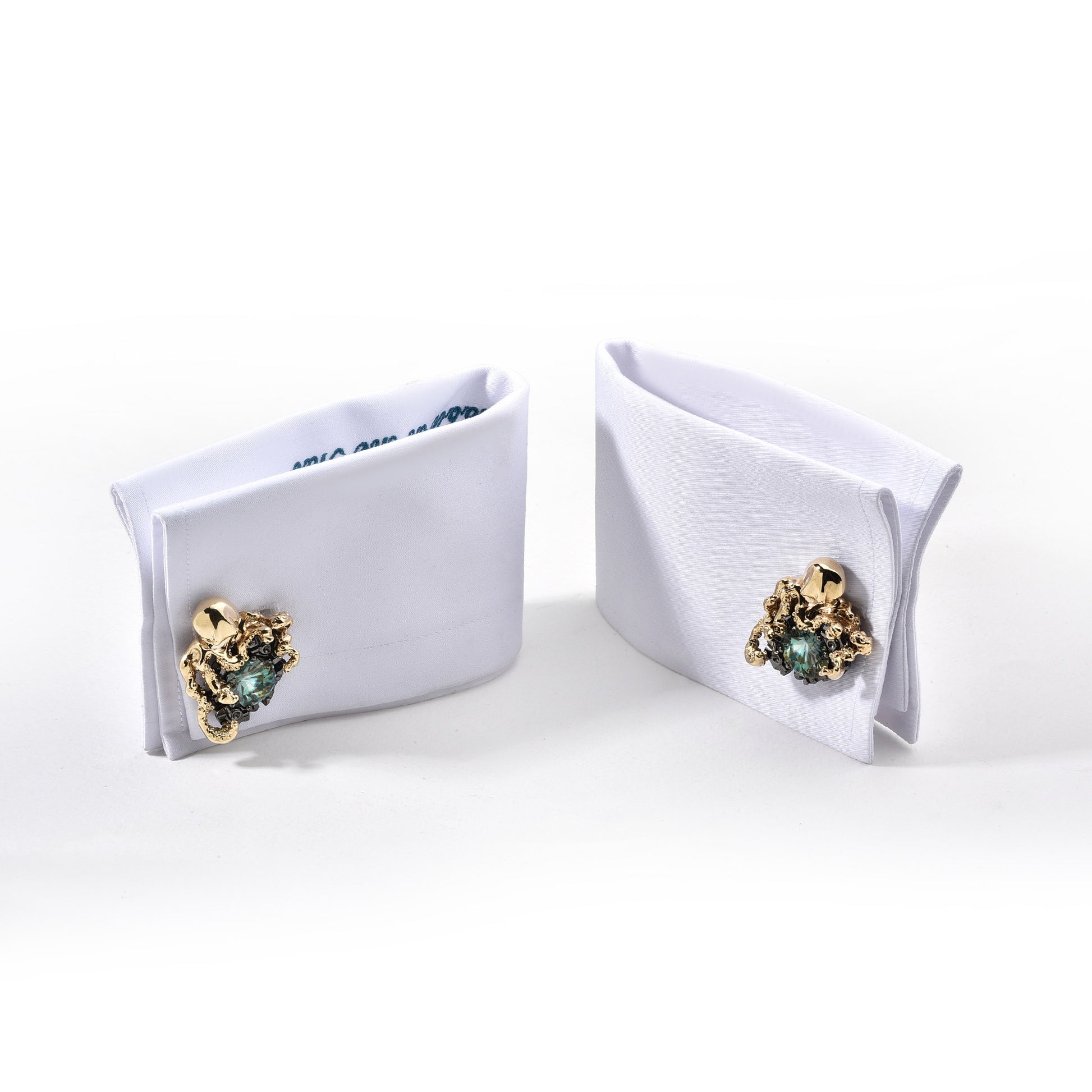 Exclusive ladies' cufflinks in dramatic bicolor execution with imposing blue moissanite as fiery centerstone. The fantastic motif of an octopus wrapping around the setting embodies the playful extravagance of our Baroque collection. Including own cuffs of finest Egyptian cotton – perfect to combine with a sleeveless evening dress for an unmistakable, luxurious appearance.
