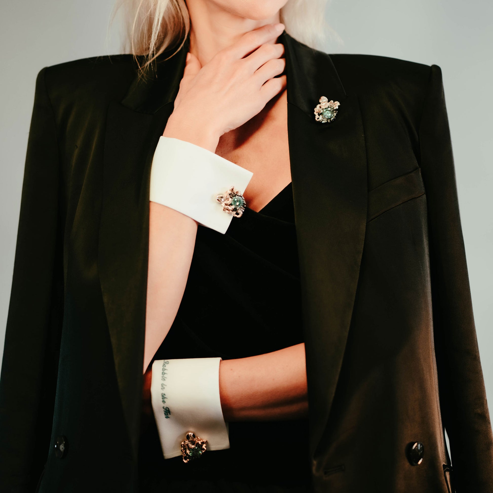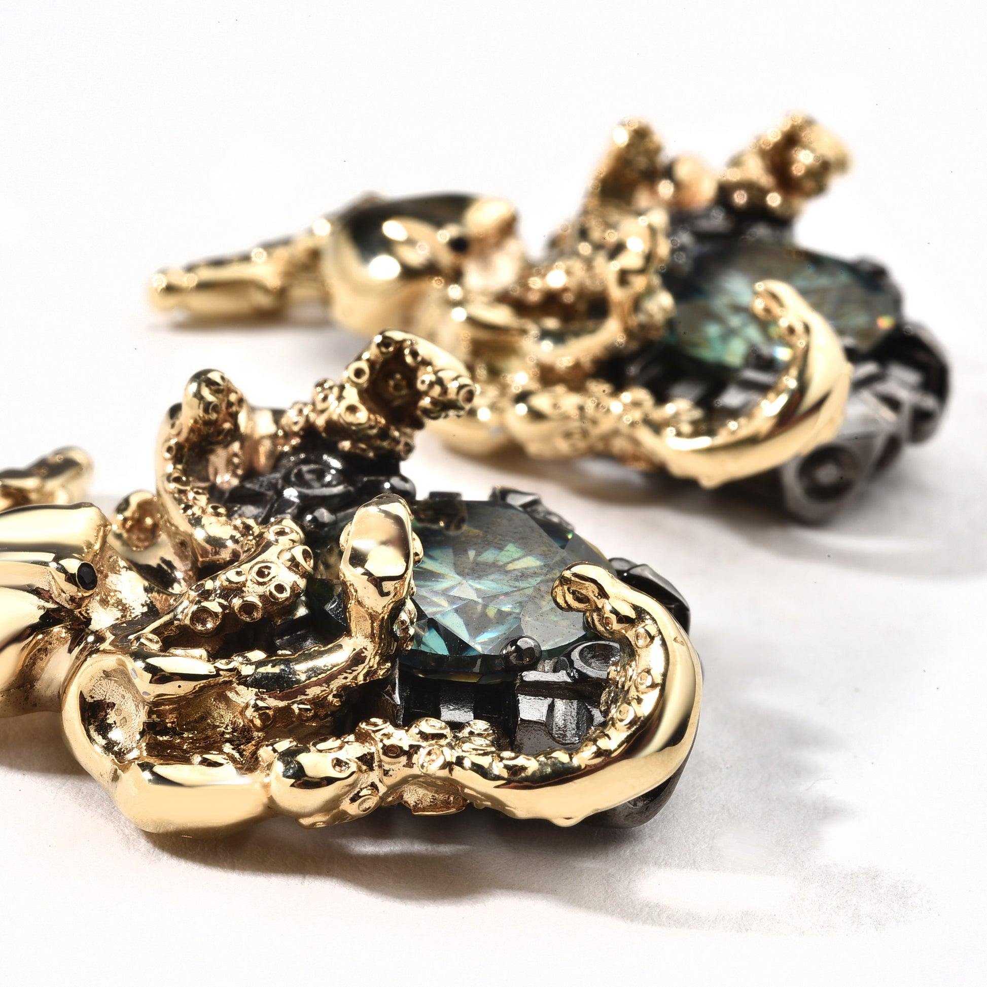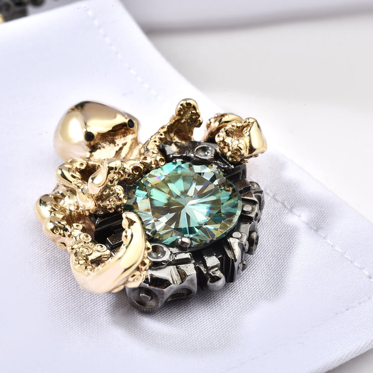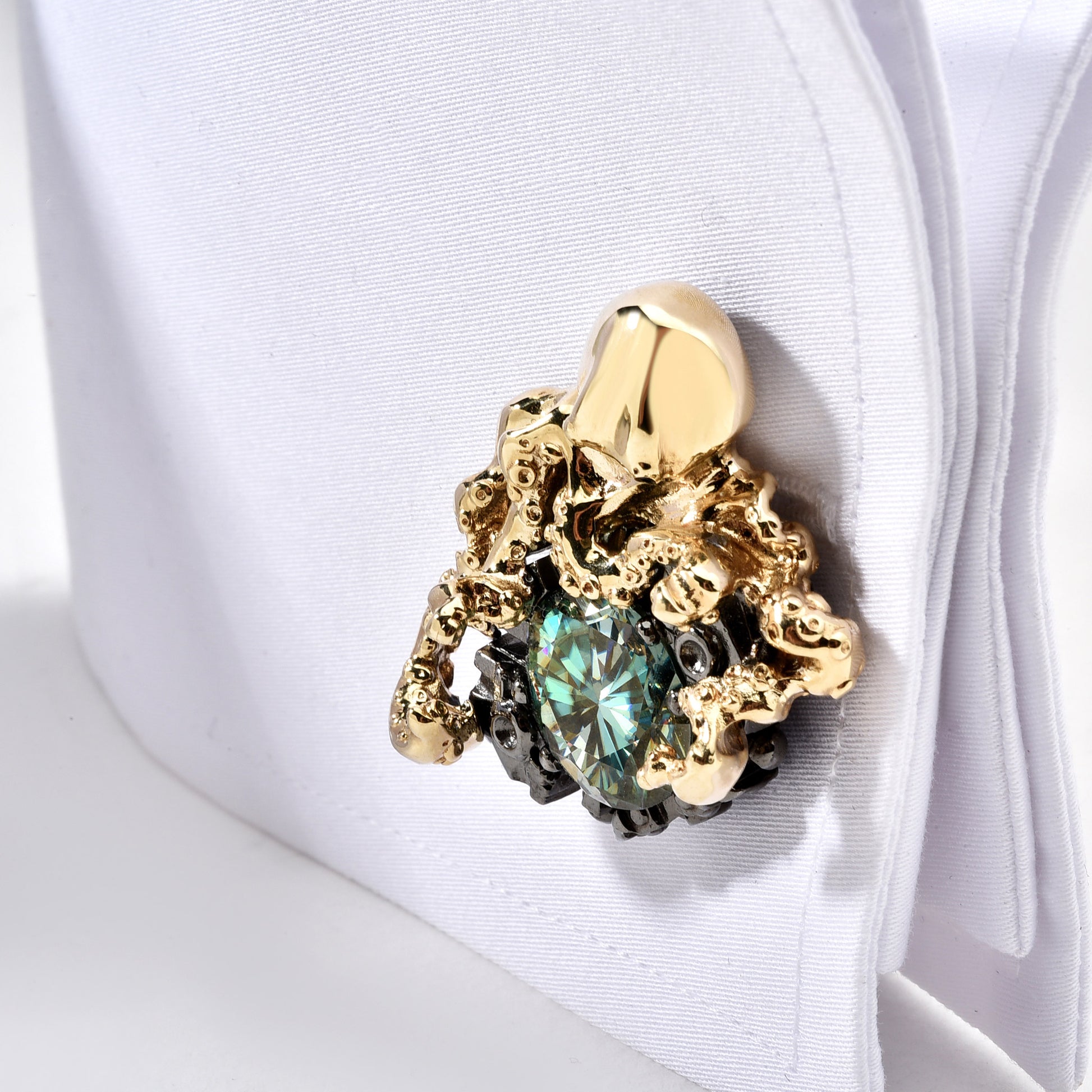 Exclusive ladies' cufflinks in dramatic bicolor execution with imposing blue moissanite as fiery centerstone. The fantastic motif of an octopus wrapping around the setting embodies the playful extravagance of our Baroque collection. Including own cuffs of finest Egyptian cotton – perfect to combine with a sleeveless evening dress for an unmistakable, luxurious appearance.