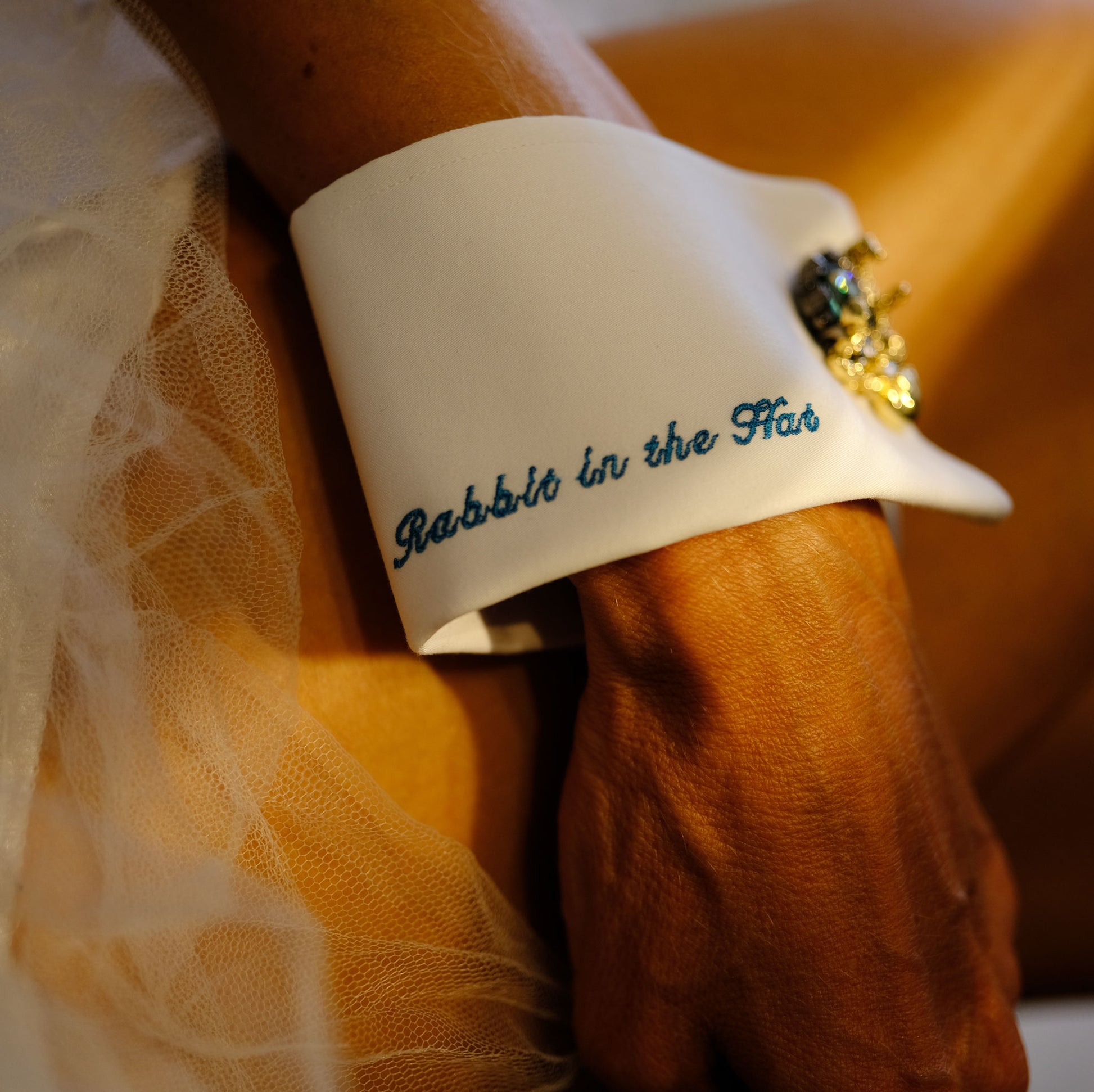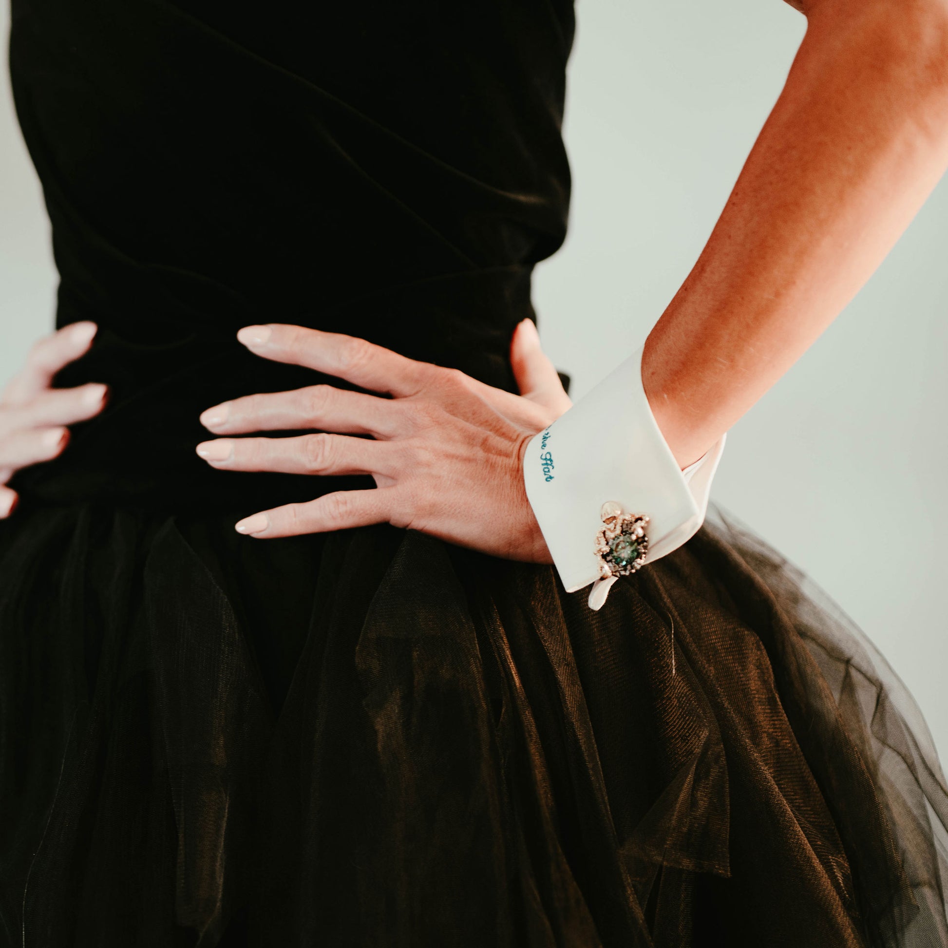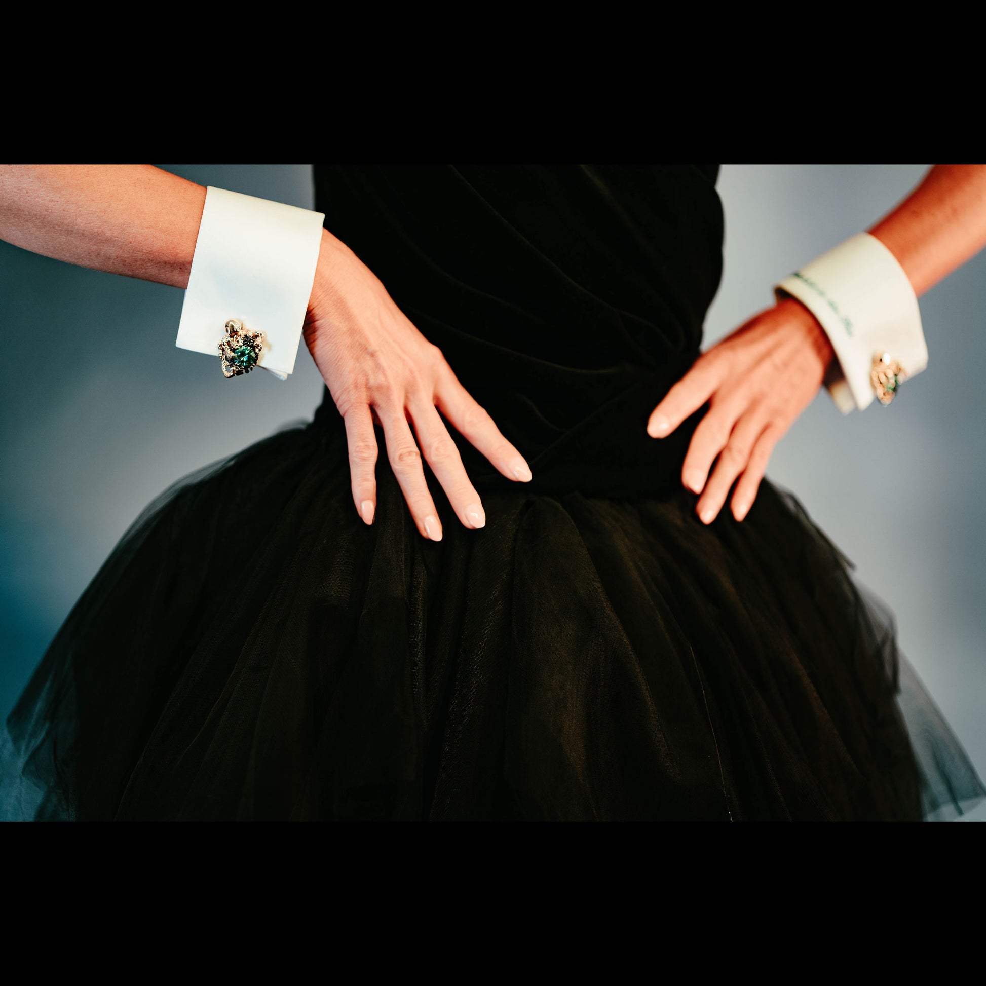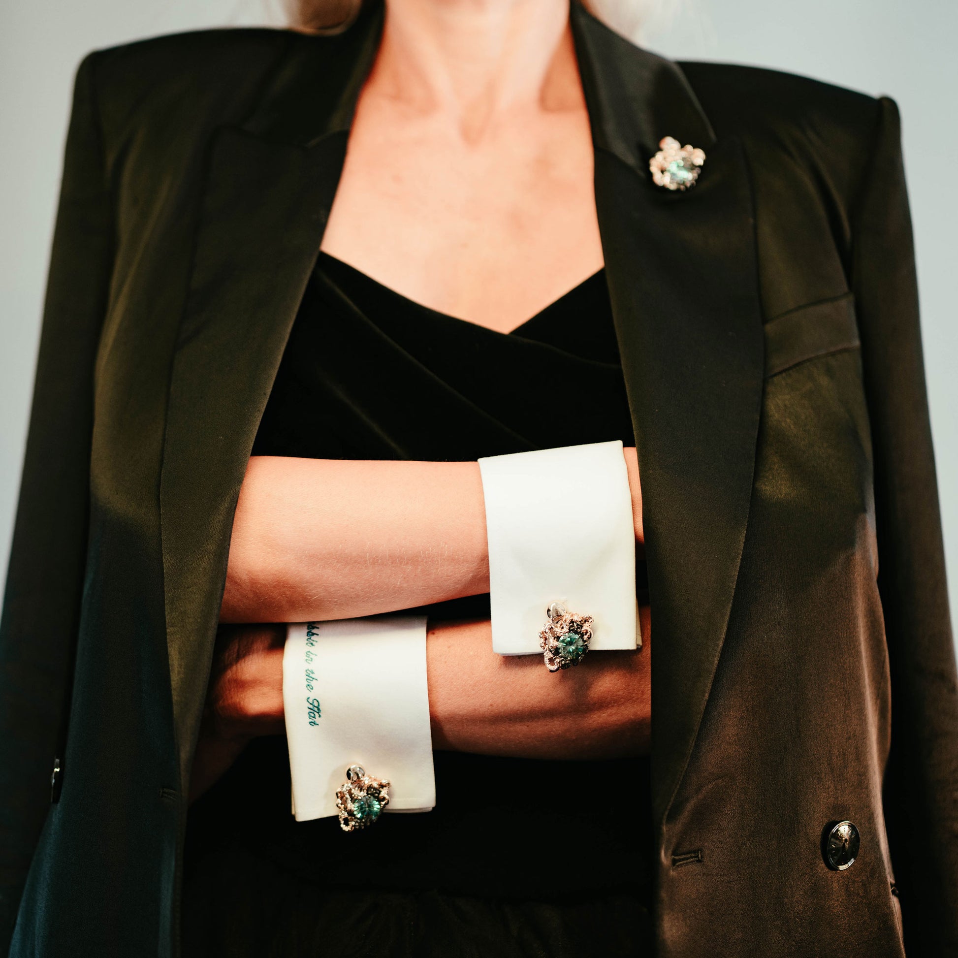 Exclusive ladies' cufflinks in dramatic bicolor execution with imposing blue moissanite as fiery centerstone. The fantastic motif of an octopus wrapping around the setting embodies the playful extravagance of our Baroque collection. Including own cuffs of finest Egyptian cotton – perfect to combine with a sleeveless evening dress for an unmistakable, luxurious appearance.