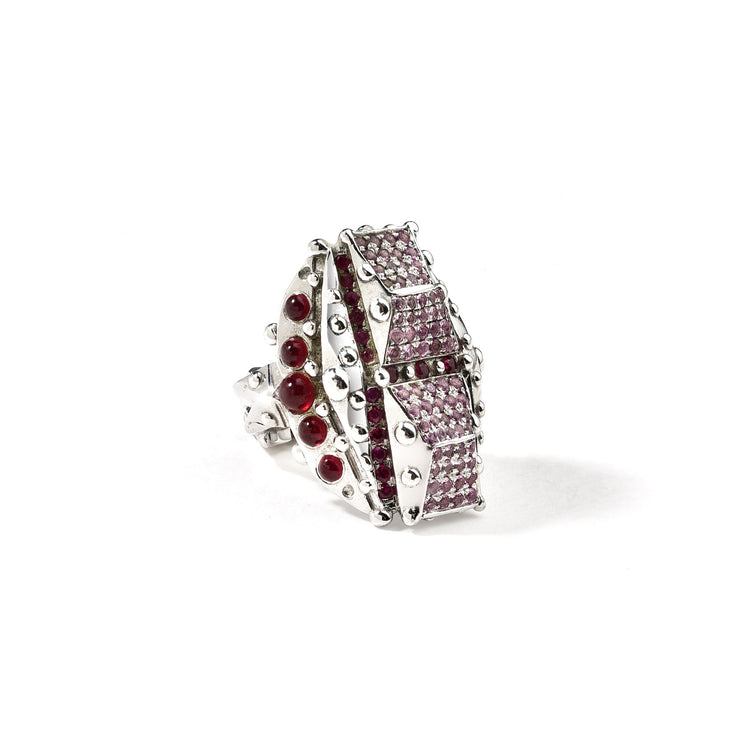 Opulent massive ring with luminous rubies and delicate pink sapphires. The noble rhodium-plated silver setting emphasizes the intensive color brilliance of the gemstones. A magnificent statement piece from our Baroque collection with luxurious character and timeless craftsmanship.