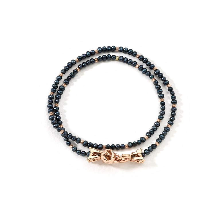 Elegant double wrapped bracelet with noble blue-black pearls and warm rose gold spacer elements in harmonious alternation. The characteristic Signature Skull clasp completes the refined design. A versatile piece of jewelry from our Baroque collection distinguished by subtle opulence and comfortable wear