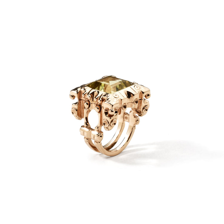 Luxurious massive ring in warm 14 kt rose gold with luminous citrine as centerstone. The opulent setting emphasizes the sunny character of the gemstone and creates a radiant highlight on your hand.